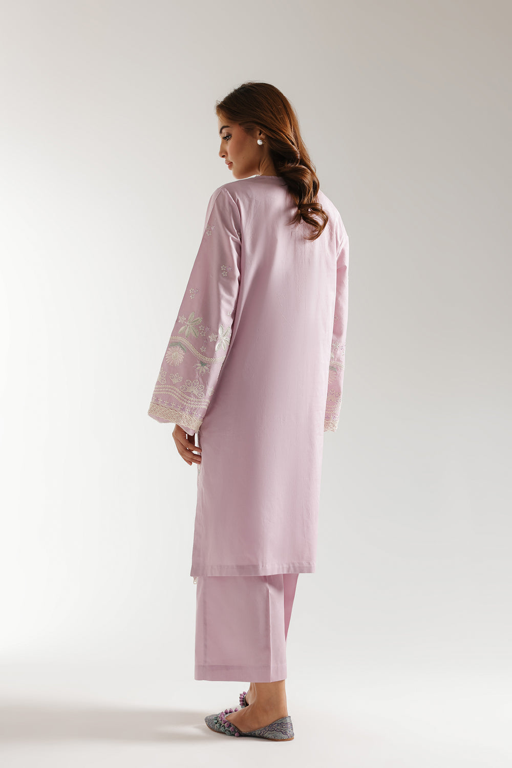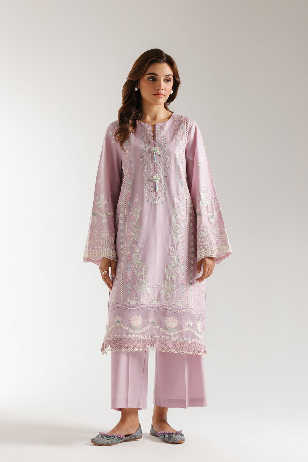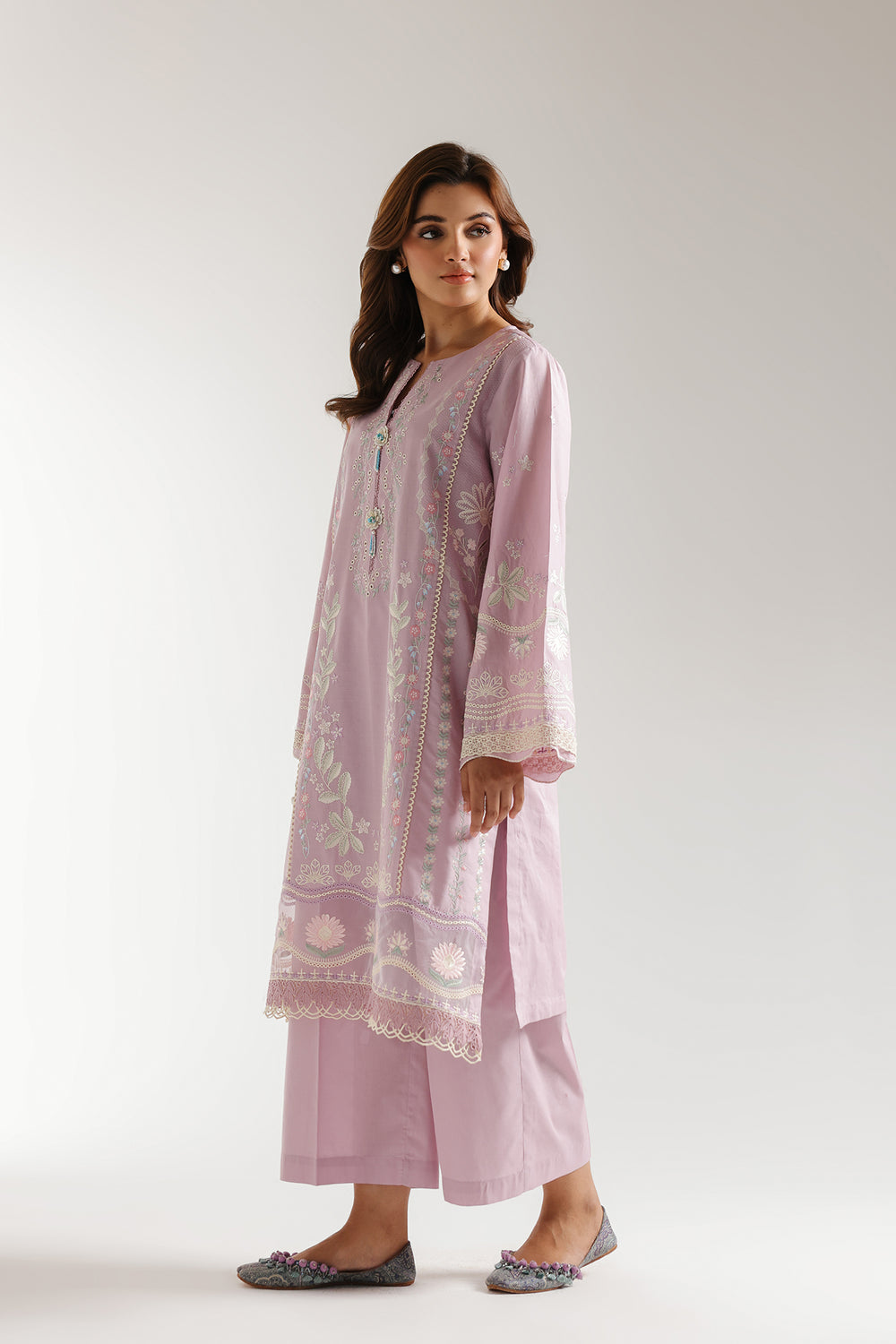 Experience a timeless yet modern look with this stunning ensemble. The elegant lilac shirt is enriched with delicate floral embroidery using intricate techniques and schiffli details enhanced with teal, white and pink accents. The trendy solid culotte trouser complete the statement look, making this graceful outfit an exquisite addition to your summer wardrobe.