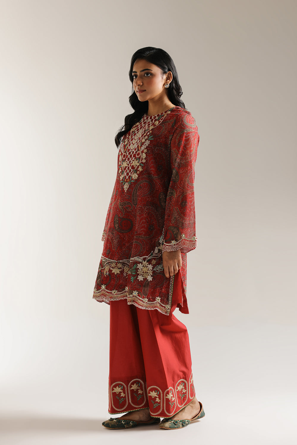 Step into an aura of profound elegance with this stunning three-piece ensemble, a masterful blend of rich textures and intricate detailing. The opulent ruby red kurta is a canvas of sophistication, featuring a detailed printed base beautifully overlaid with exquisite embroidery around the neckline and borders. The wide, flowing sleeves add to its graceful silhouette. It comes complete with a coordinating inner slip for seamless comfort and modesty. Paired with elegant matching wide-leg shalwar, also adorned with complementary embroidered motifs at the hem, this outfit is perfect for making an unforgettable statement at grand celebrations, formal events, or any sophisticated gathering.