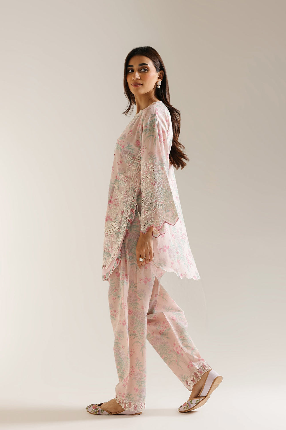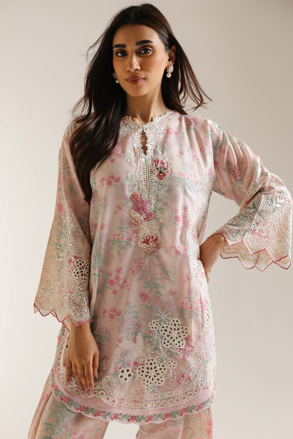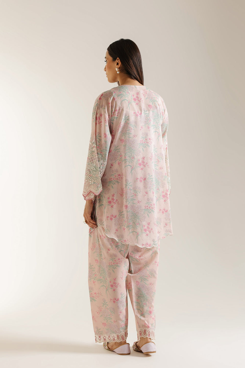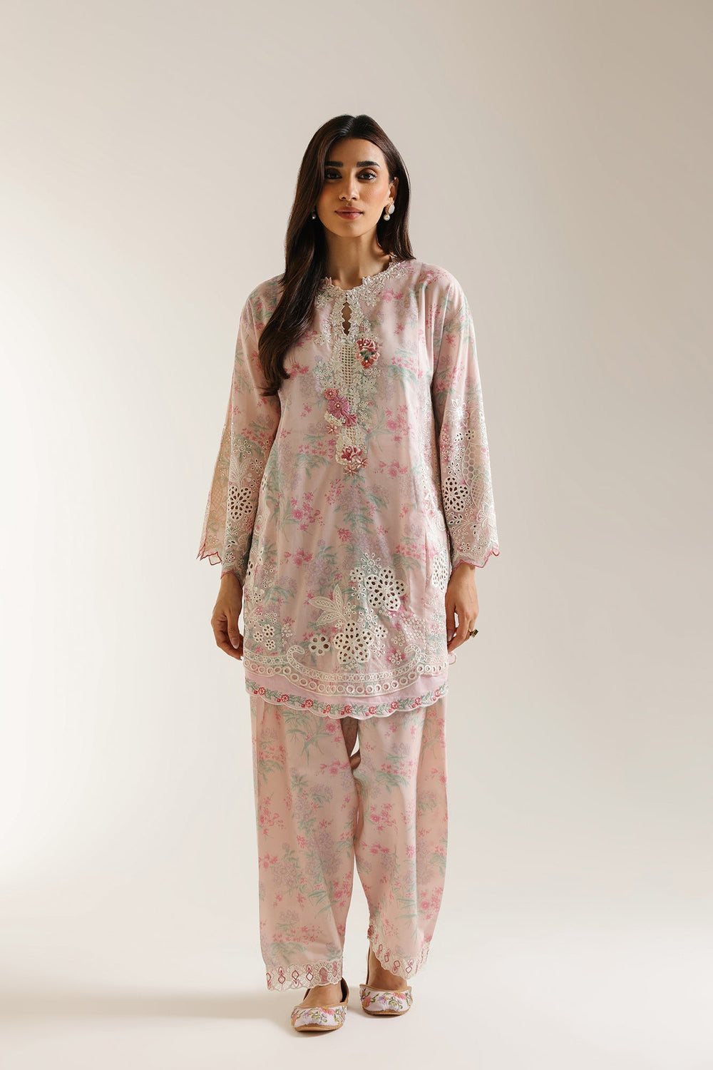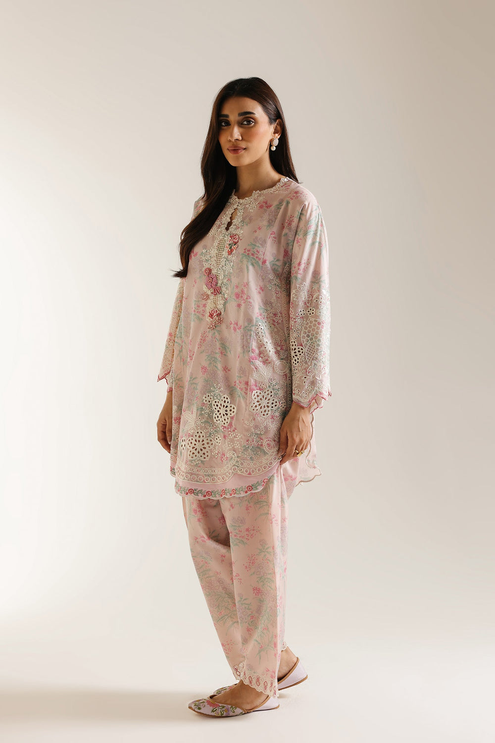 Drift into a dream of delicate beauty with this enchanting two-piece ensemble, a perfect harmony of soft pink and intricate floral artistry. The elegant kurta features a charming all-over floral print in subtle hues, beautifully enhanced with exquisite white embroidery, detailing the neckline and side panels. Delicate cutwork on the sleeves and hem adds an extra touch of sophistication. It is perfectly complemented by coordinating shalwar, completing this ethereal look. This outfit is ideal for smart casual events, festive gatherings, or making a distinctive and graceful statement.