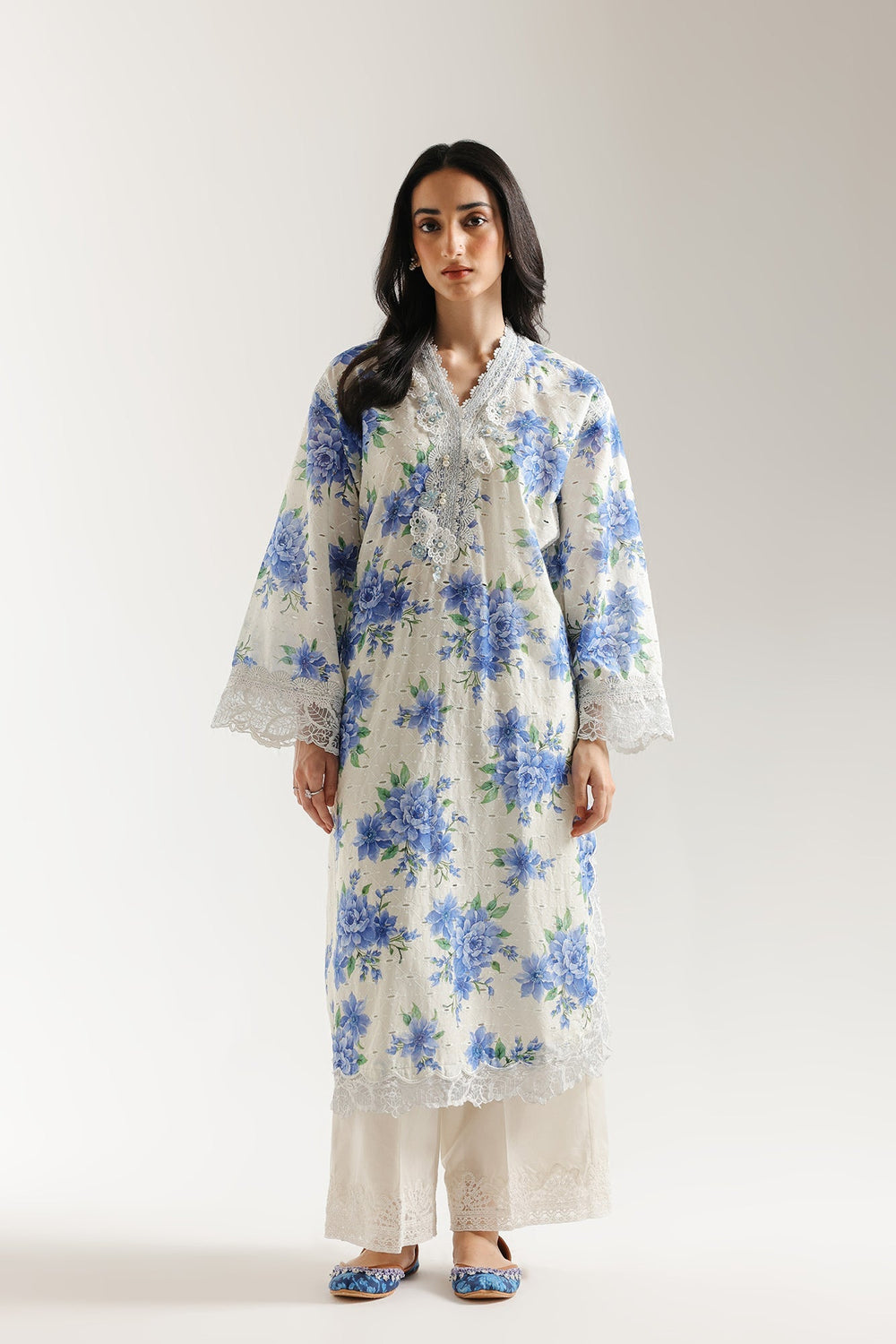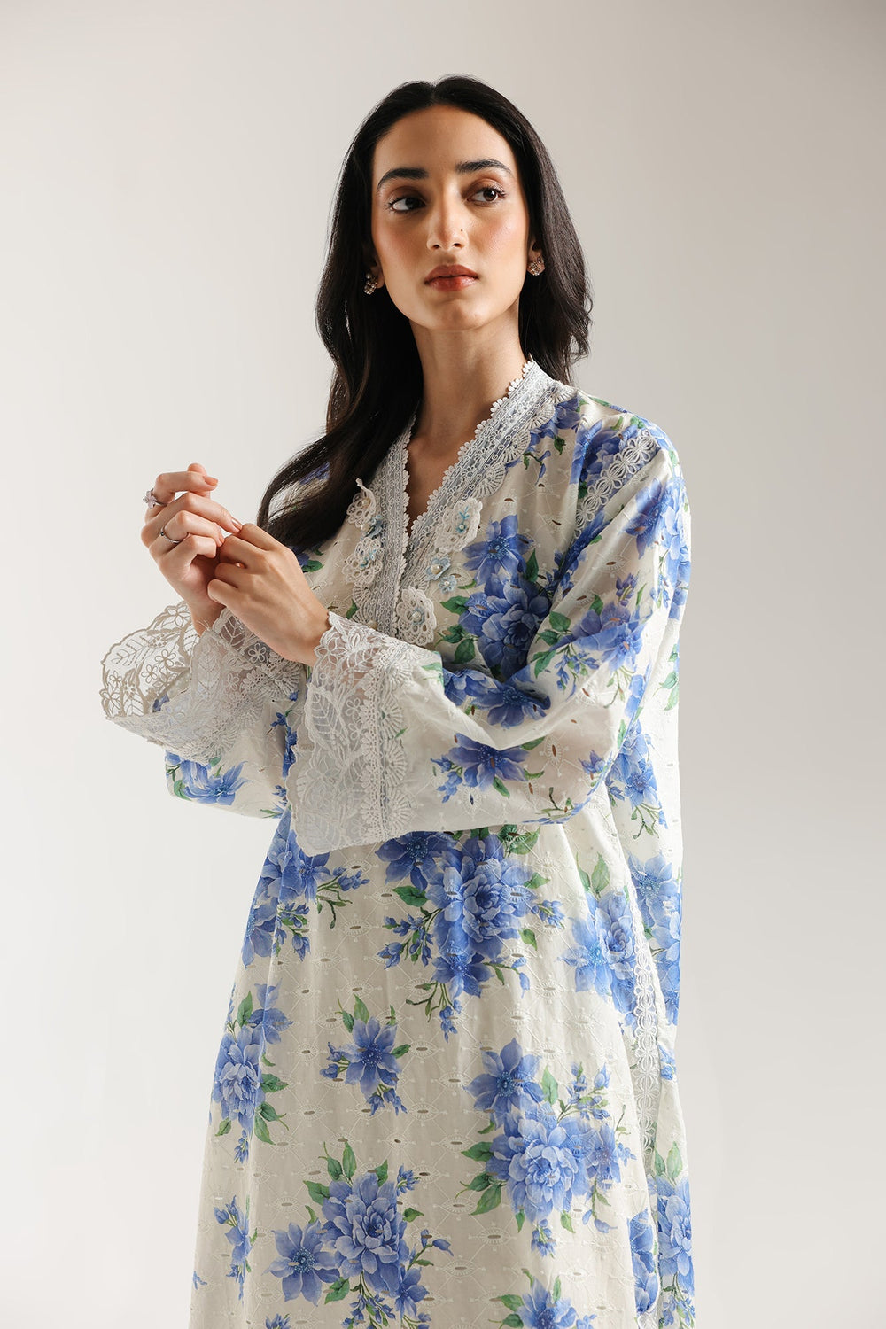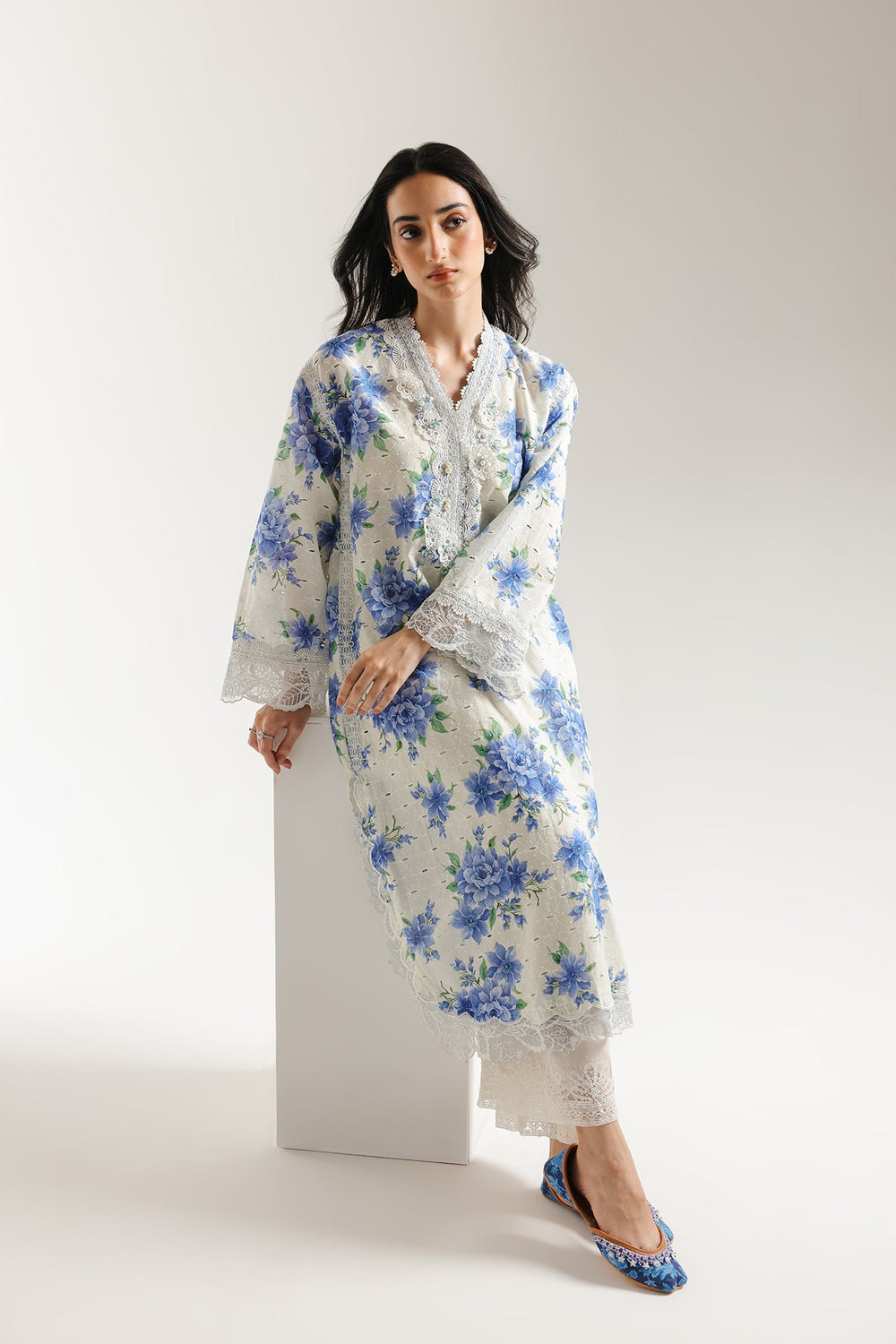 Drape yourself in the ethereal beauty of this enchanting embroidered suit. The long, A line kurta is crafted from a sheer white schiffli fabric and features a breathtaking all-over floral print in soft, vivid blue. The V-neckline is beautifully adorned with intricate white lace and stitch detailing, which also gracefully accents the wide cuffs and the hemline. The ensemble is perfectly completed with voluminous, white flared trousers that feature elegant eyelet embroidery at the hem, creating a light, airy, and stunningly artistic look