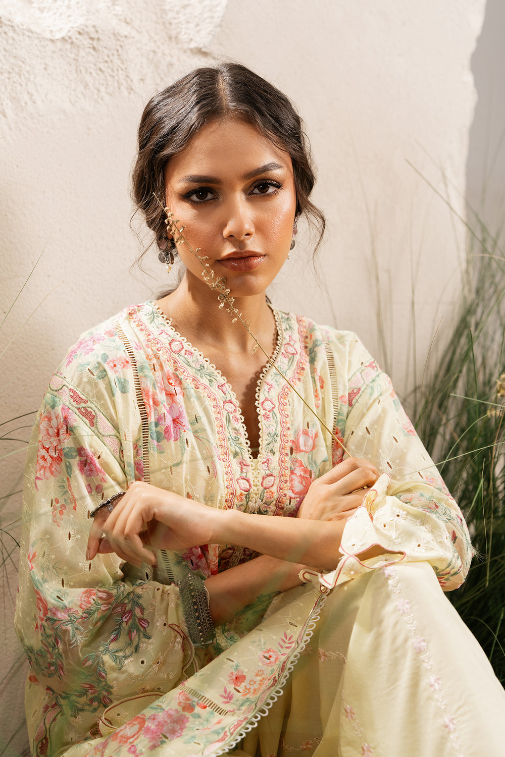 Drift into a garden of style with this enchanting embroidered suit. The light, buttery yellow fabric is a delicate canvas for subtle floral prints and intricate embroidery that gracefully adorns the neckline and sleeves. Delicate lace trim and cutwork details add a touch of refined artistry, while the coordinating straight trousers with embroidered accents complete this beautiful and ethereal ensemble.
