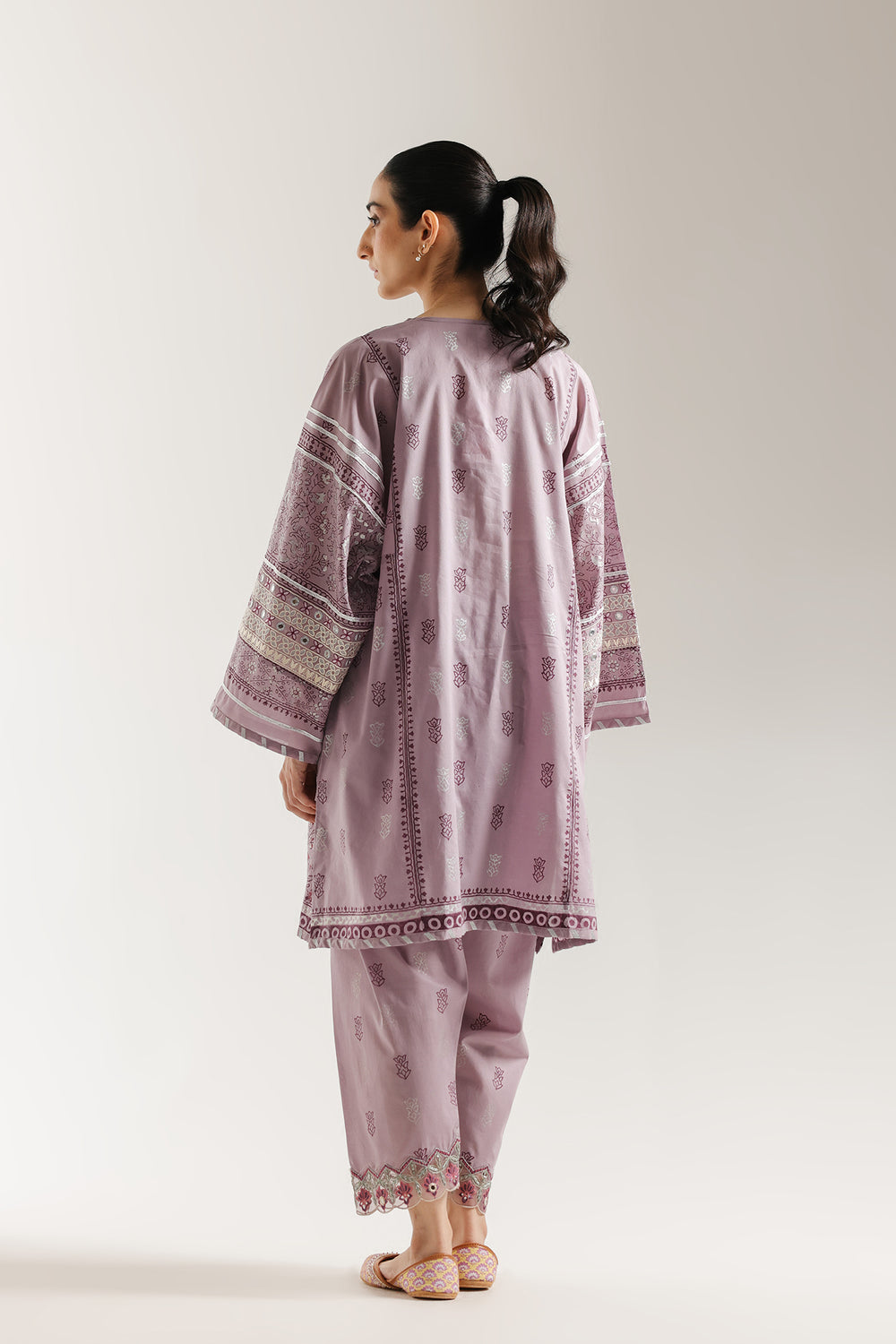 Embrace a regal aesthetic with this mesmerizing mauve embroidered suit. The straight-cut kurta is a masterpiece of texture and embellishment, featuring a stunning array silver and dark grey embroidery in intricate geometric and stylized paisley patterns that cover the front, neckline, and cuffs of the wide, flowing sleeves. The ensemble is elegantly paired with tailored shalwar in a matching shade, which feature a subtle printed motif and embroidered hem to complement the richness of the top. This suit is the perfect choice for a sophisticated, statement-making occasion.