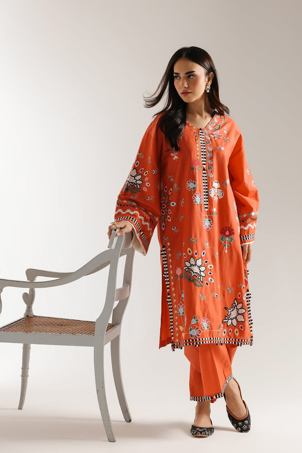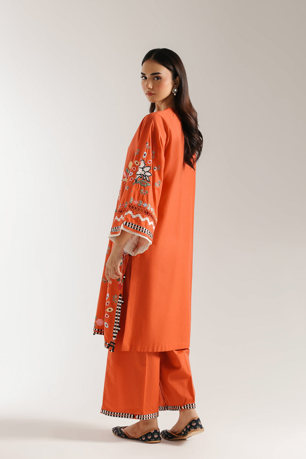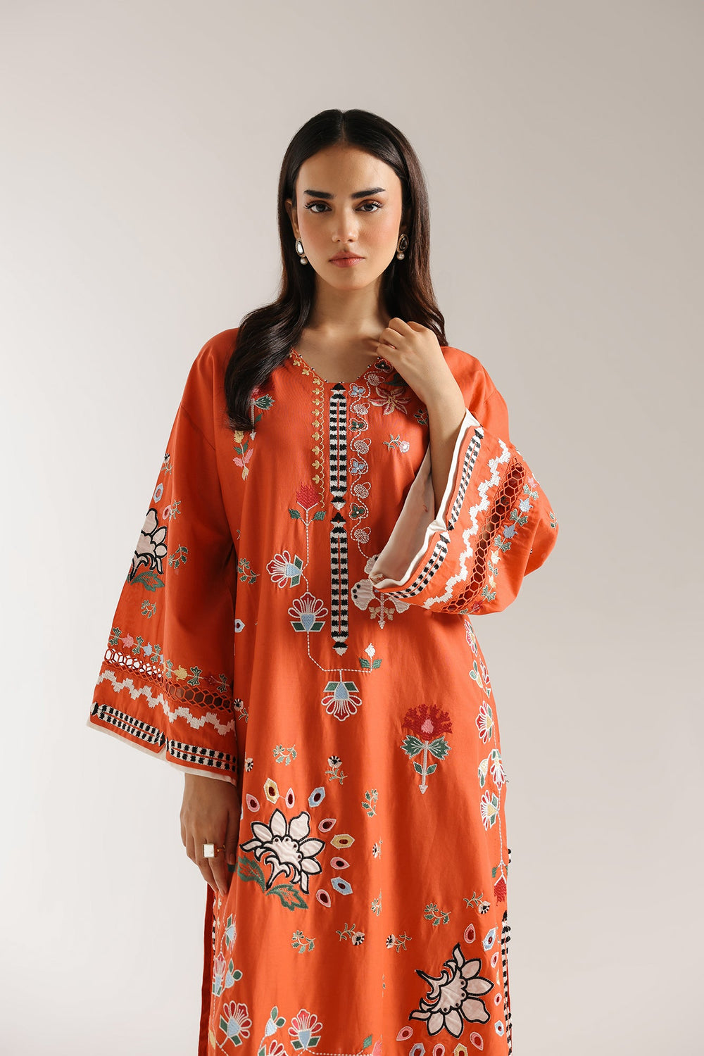 Bask in the warm glow of our sunset meadow ensemble, a vibrant two-piece adorned with exquisite white and black embroidery across the front and wide sleeves, complemented by striking geometric details at the V-neckline and cuffs. Paired with matching solid trouser, this outfit is a captivating blend of radiant color and intricate artistry, perfect for making a stylish statement.