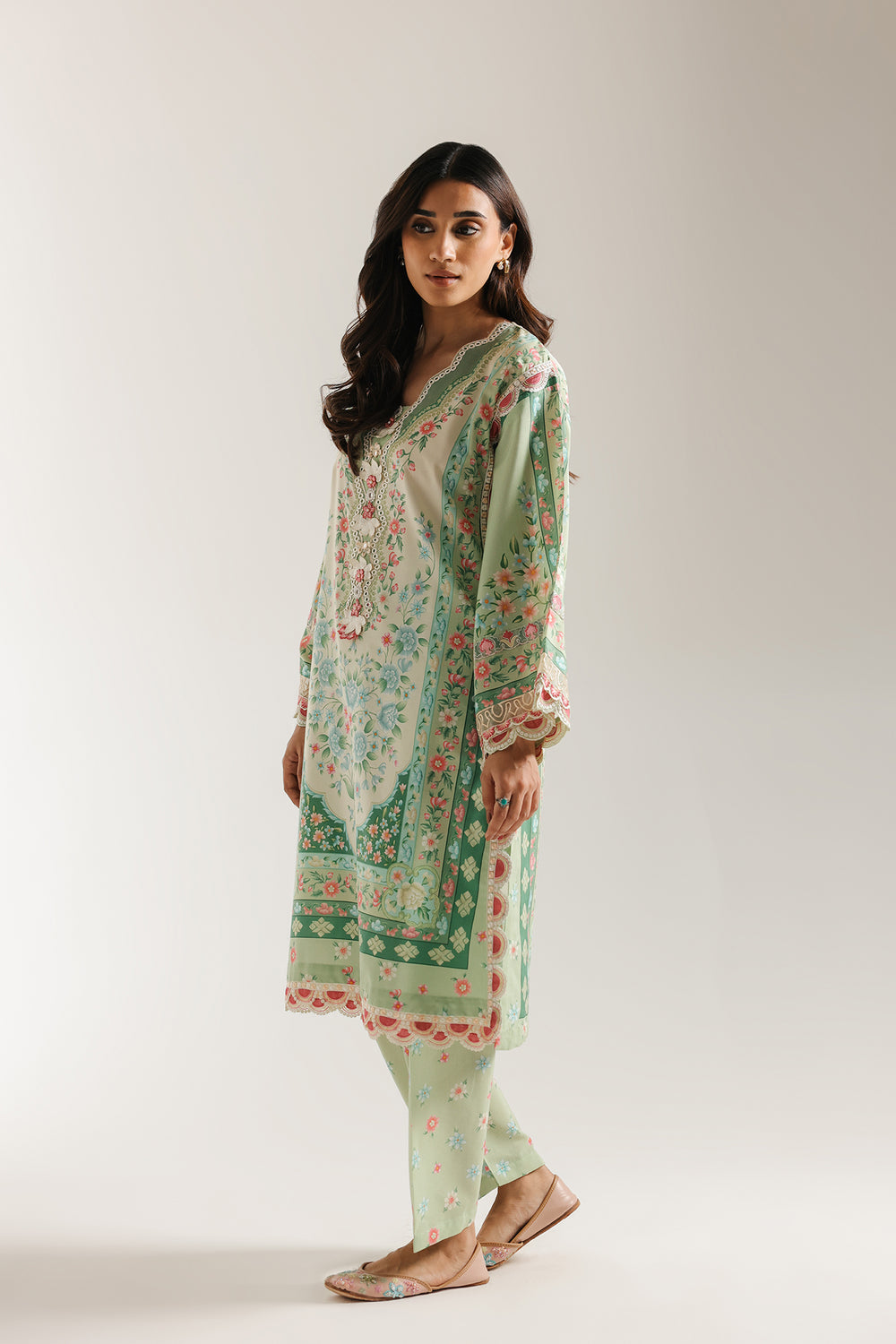 Bask in the fresh elegance of this exquisite mint green printed and embroidered Suit. The straight-cut kurta features a beautiful all-over mughal-inspired floral print in delicate shades of pink, dusty rose, and olive green. The neckline is lavishly detailed with intricate floral embroidery and embellishments, creating a stunning focal point. The wide sleeves and hem are finished with coordinating printed borders and delicate lace trim. The ensemble is perfectly matched with comfortable shalwar featuring a subtle floral print and elegant hem detail, creating a harmonious and graceful look.