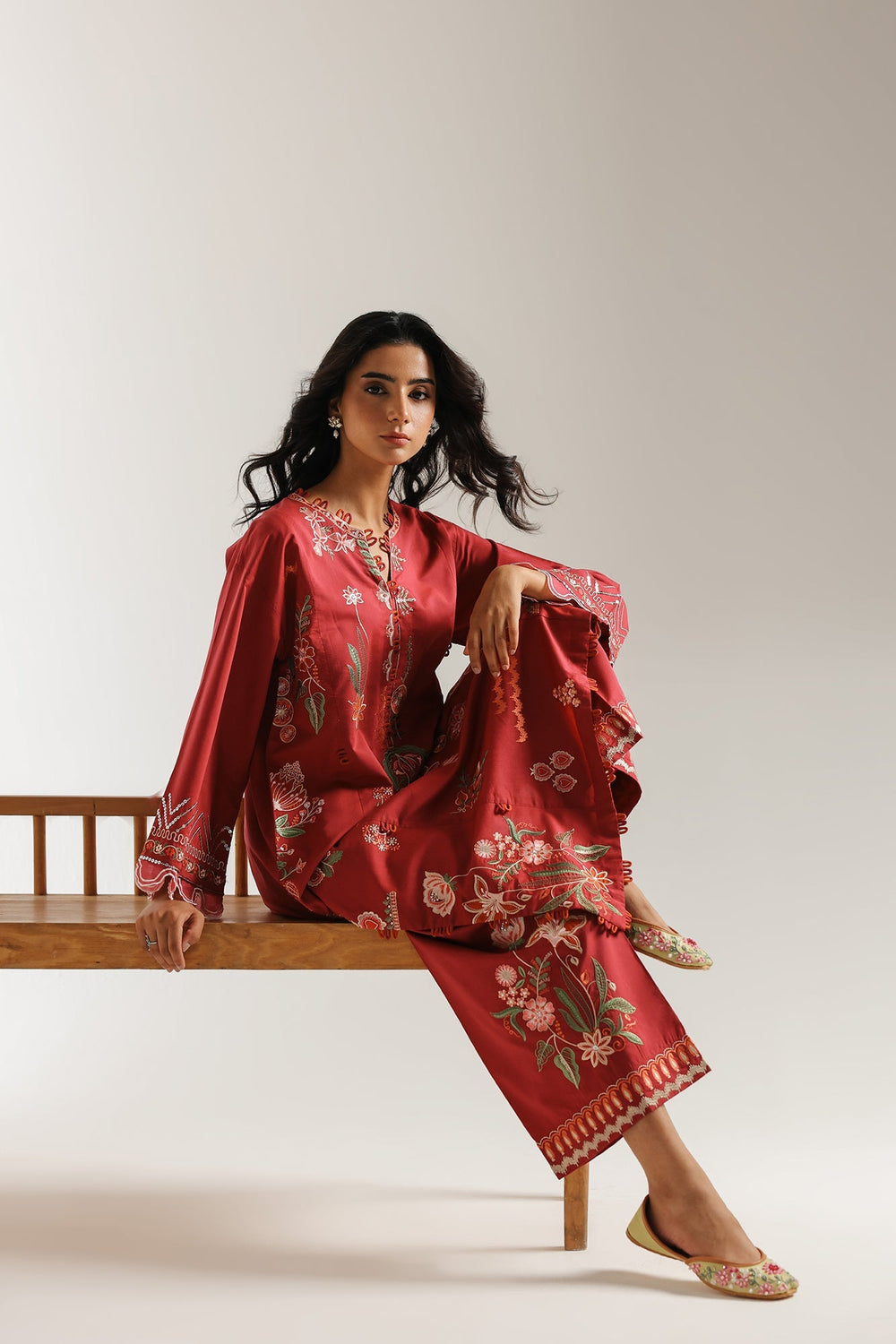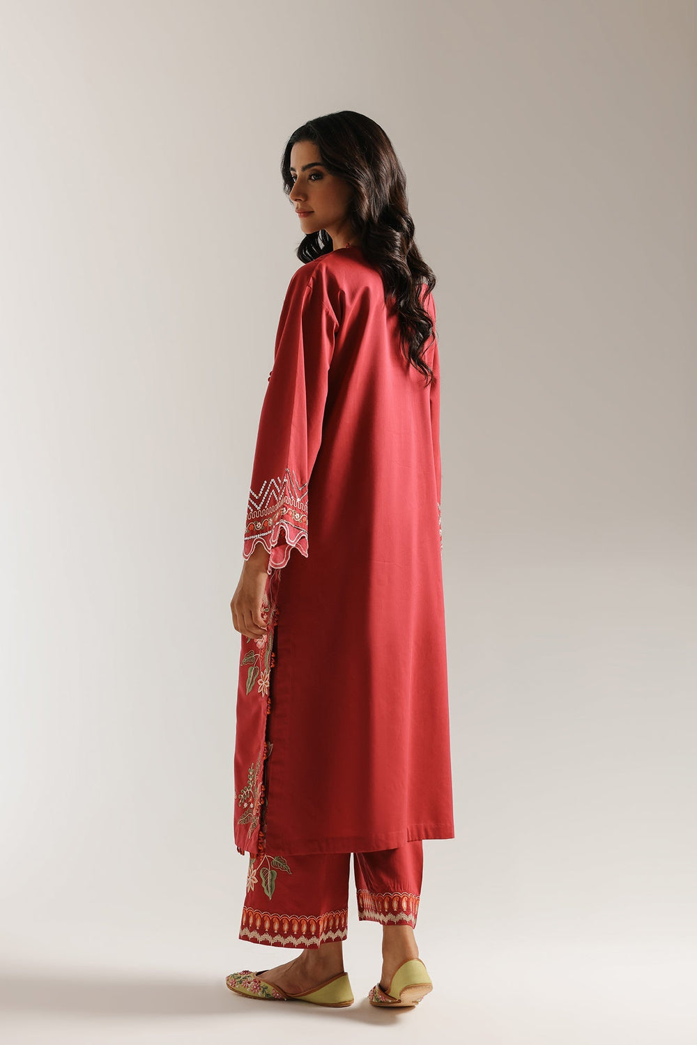 Unleash the power of pink with this stunning embroidered suit. This two-piece ensemble is a true masterpiece of intricate design. The hot pink base of the long shirt serves as a dramatic canvas for the beautiful floral and geometric embroidery in a captivating palette of white, pink, and green. The suit is completed with matching trousers, making it an ideal choice for any festive event or formal gathering.