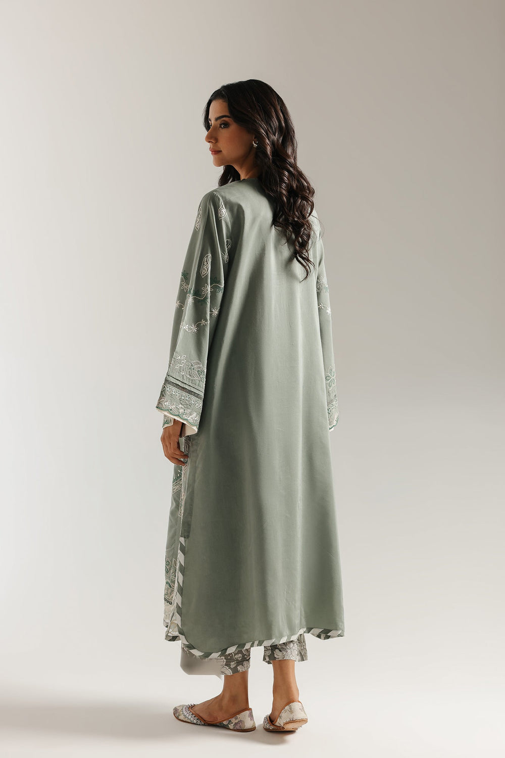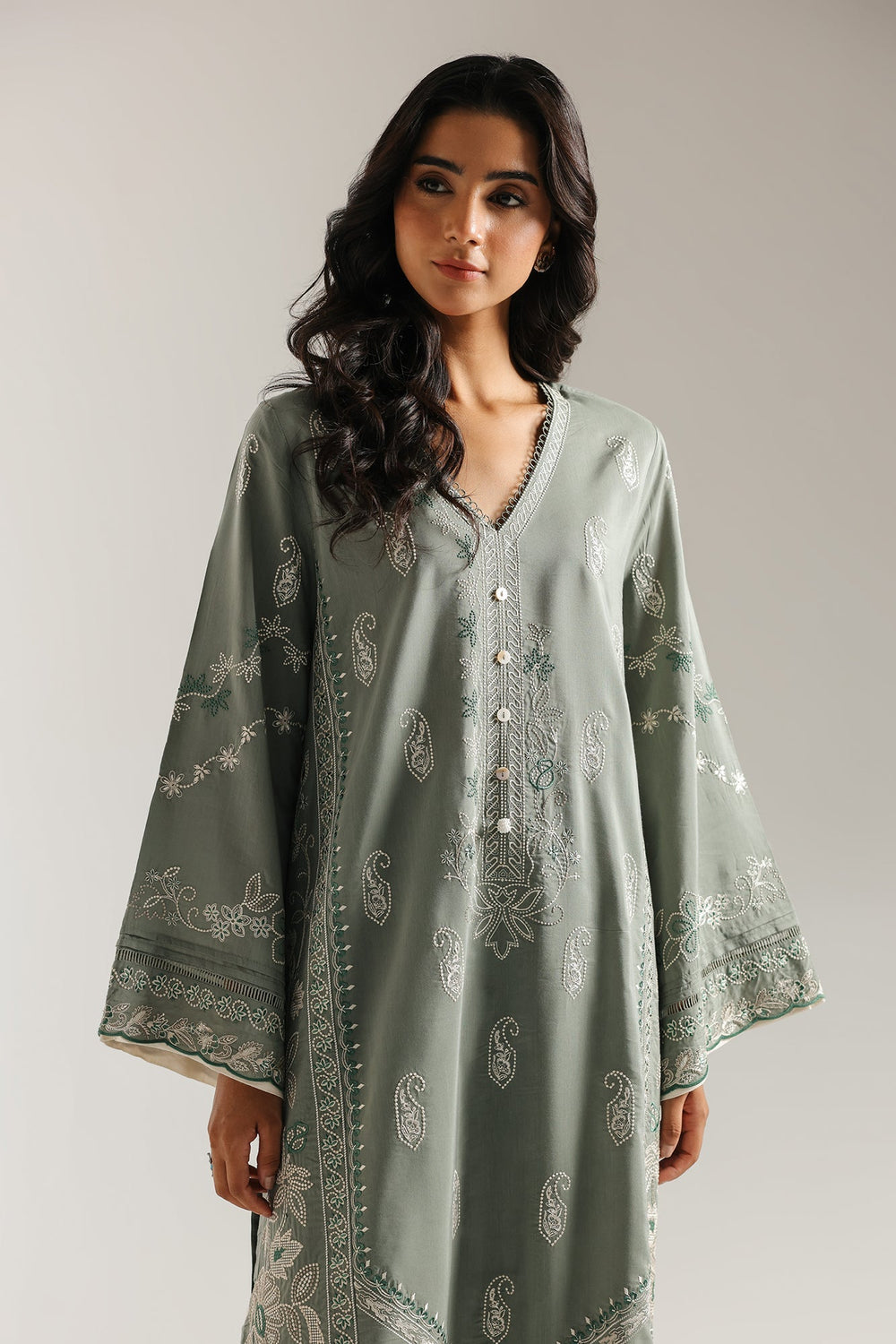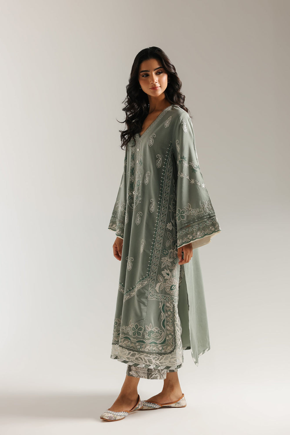 Indulge in a look that is both playful and chic with this charming embroidered suit. This beautiful khaaki suit features a comfortable, flowing silhouette. The long shirt is a graceful backdrop for the elaborate paisley and floral patterns, with embroidery and beadwork on the neckline, front and sleeves. The suit is completed with matching trouser, making it a stylish addition to any wardrobe.