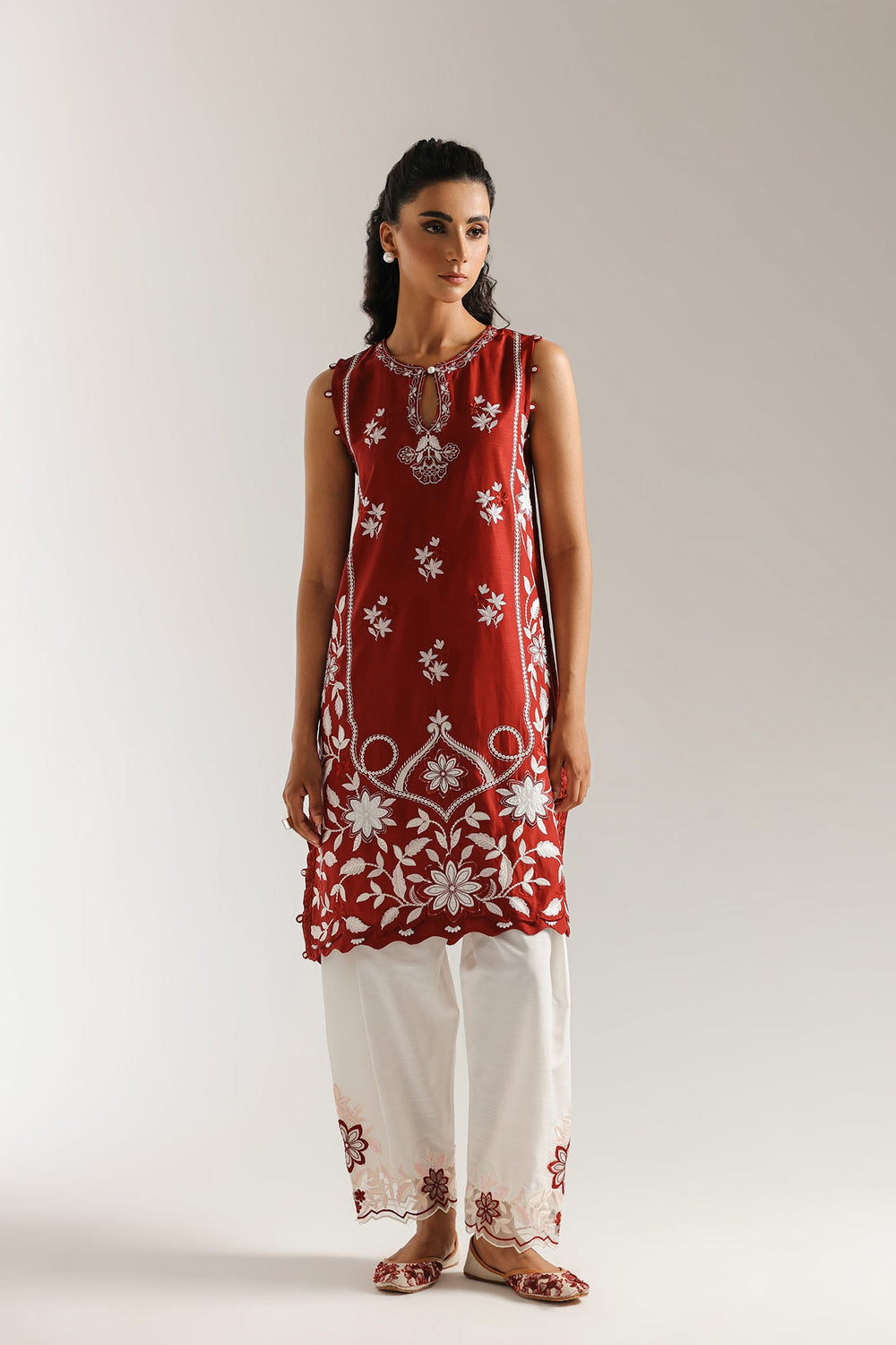 Step into the spotlight with captivating elegance. This striking embroidered suit features a sleeveless, deep red kurta adorned with intricate white floral and ornamental embroidery along the neckline, front panel, and side borders. The vibrant red contrasts beautifully with the crisp white straight shalwar, which also feature coordinating embroidered details at the hem. This ensemble is a perfect fusion of bold color and delicate artistry, designed to make a memorable impression.
