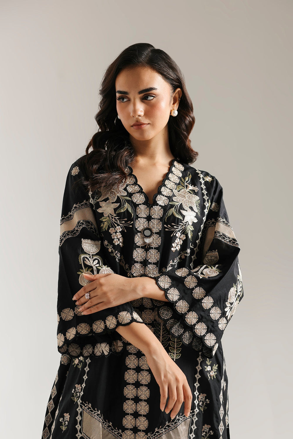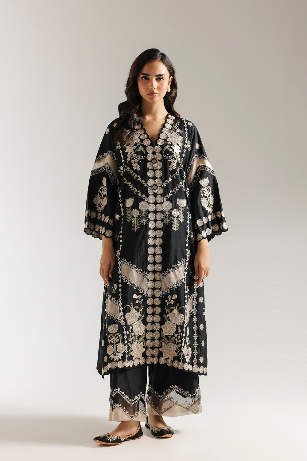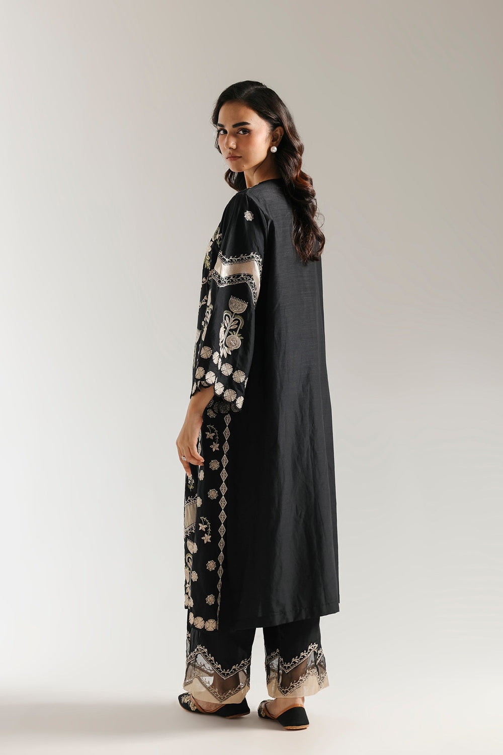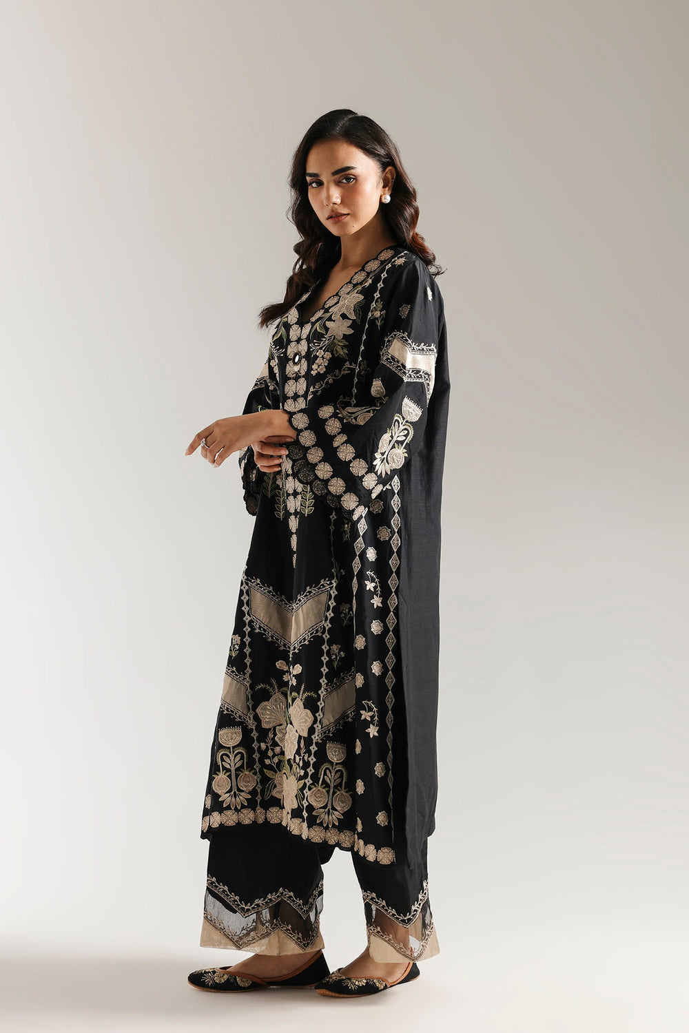 This stunning embroidered suit is a beautiful blend of traditional artistry and modern design. The deep black kurta is a canvas for intricate floral and abstract embroidery in a graceful palette of off-white and delicate beige. The unique design and elegant wide sleeves create a sophisticated and artistic look, while a perfectly coordinated trouser completes this captivating ensemble.