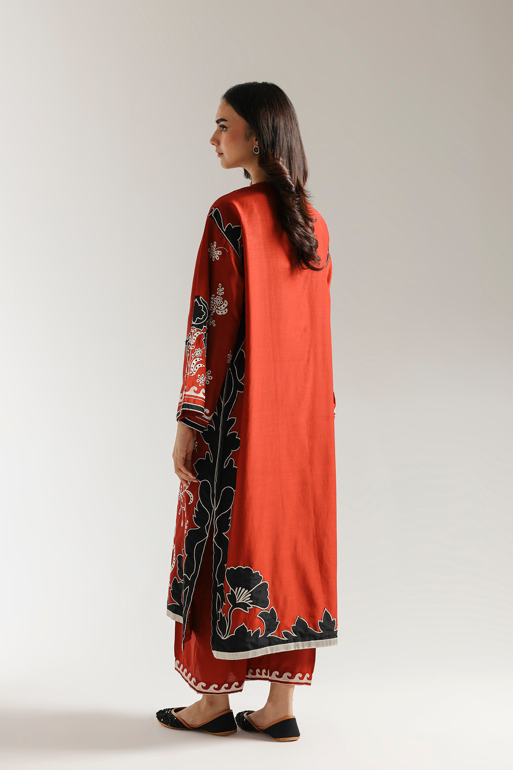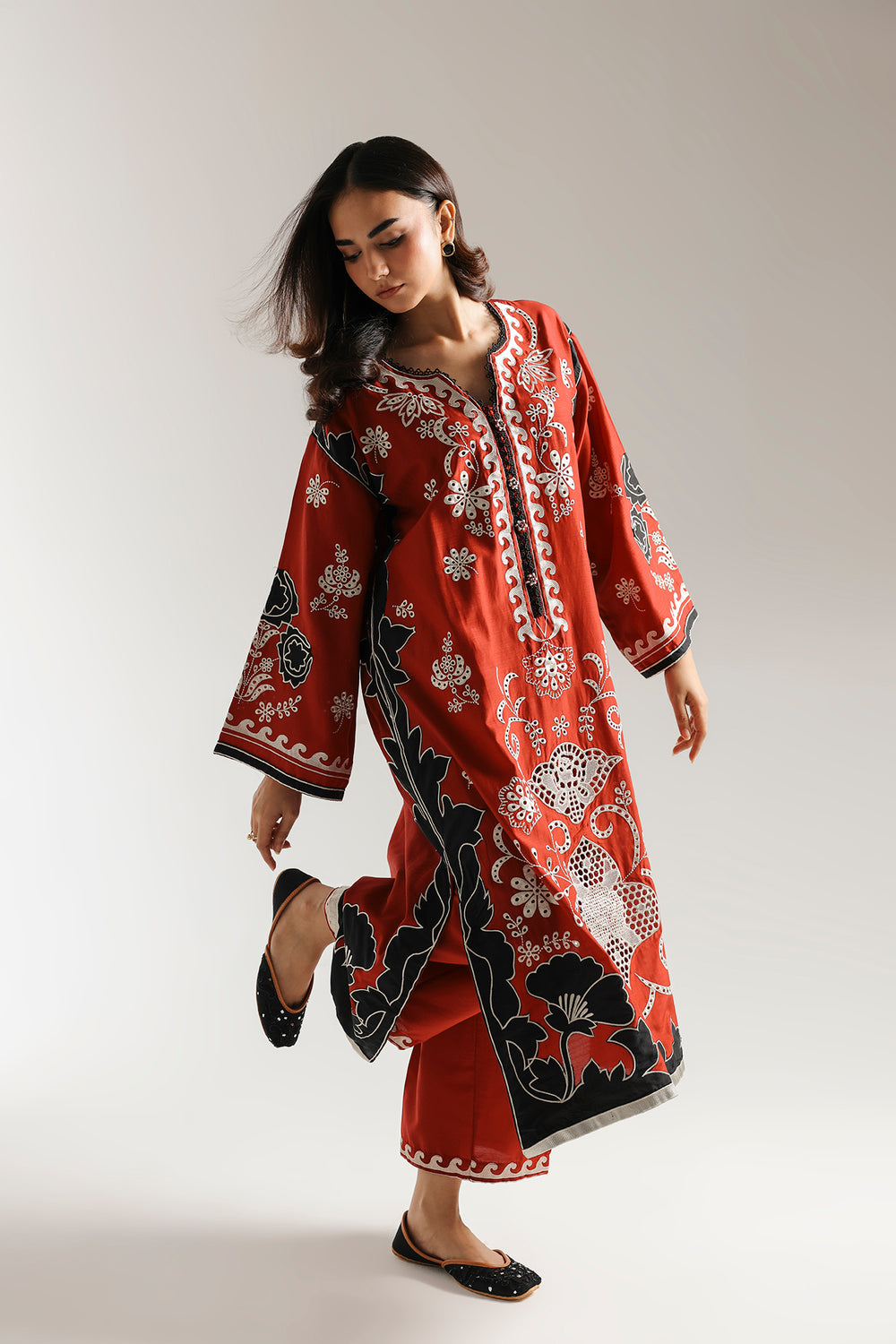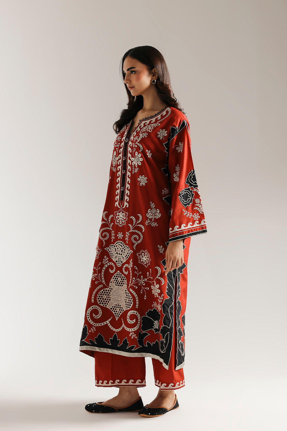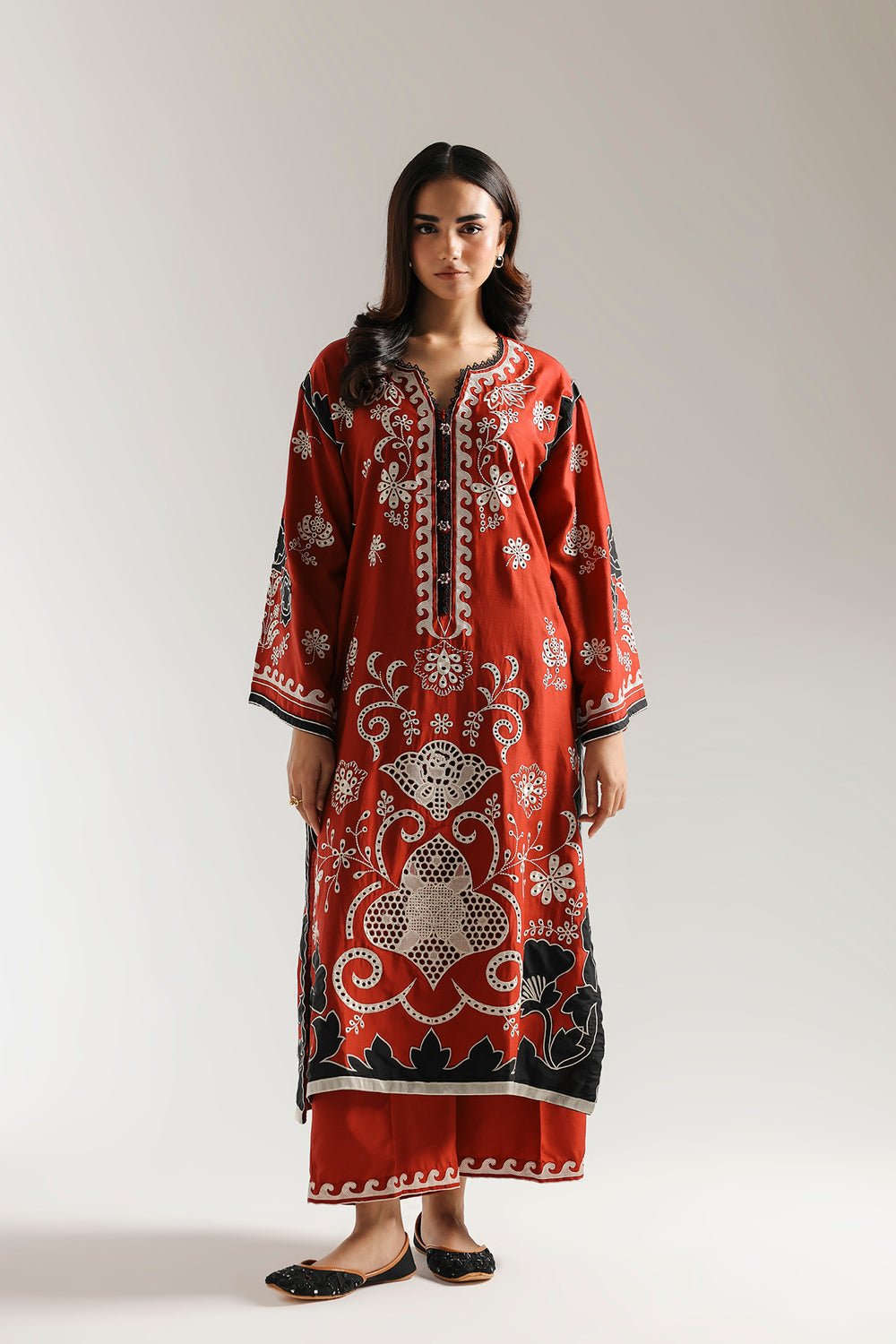 This vibrant embroidered suit is a celebration of striking contrasts and intricate design. The rich red kurta is a canvas for bold white and black embroidery, forming intricate floral and paisley patterns that stand out beautifully. The detailed patterns extend to the wide sleeves, while a coordinating red culotte trouser completes this captivating and festive ensemble.