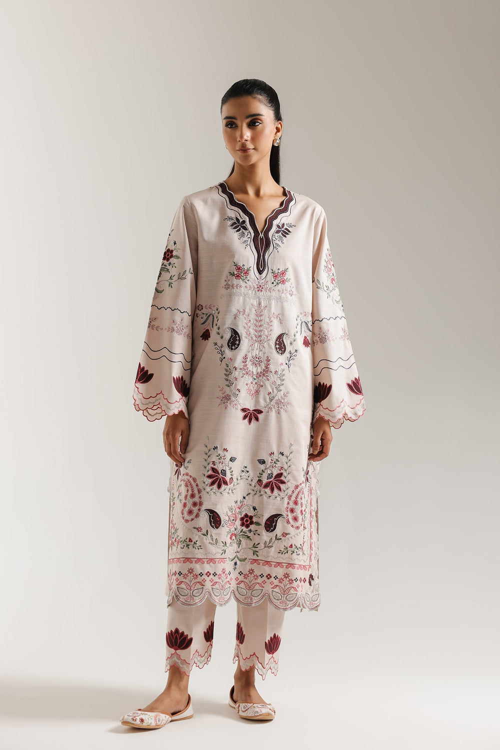 Drape yourself in feminine charm with this elegantly detailed embroidered suit. The ensemble features a long kurti and matching straight trouser crafted in a soft, delicate shade of pale coral. The shirt is richly embellished with intricate floral and paisley embroidery in deep maroon, wine, and soft green tones, which flows dramatically down the center front and along the hem. It features a V-neckline framed by a deep, embroidered border and wide sleeves with scalloped cuffs. The coordinating trouser carry a complementary ornamental embroidered motif near the hem. This sophisticated and beautifully balanced set is perfect for making a refined statement.