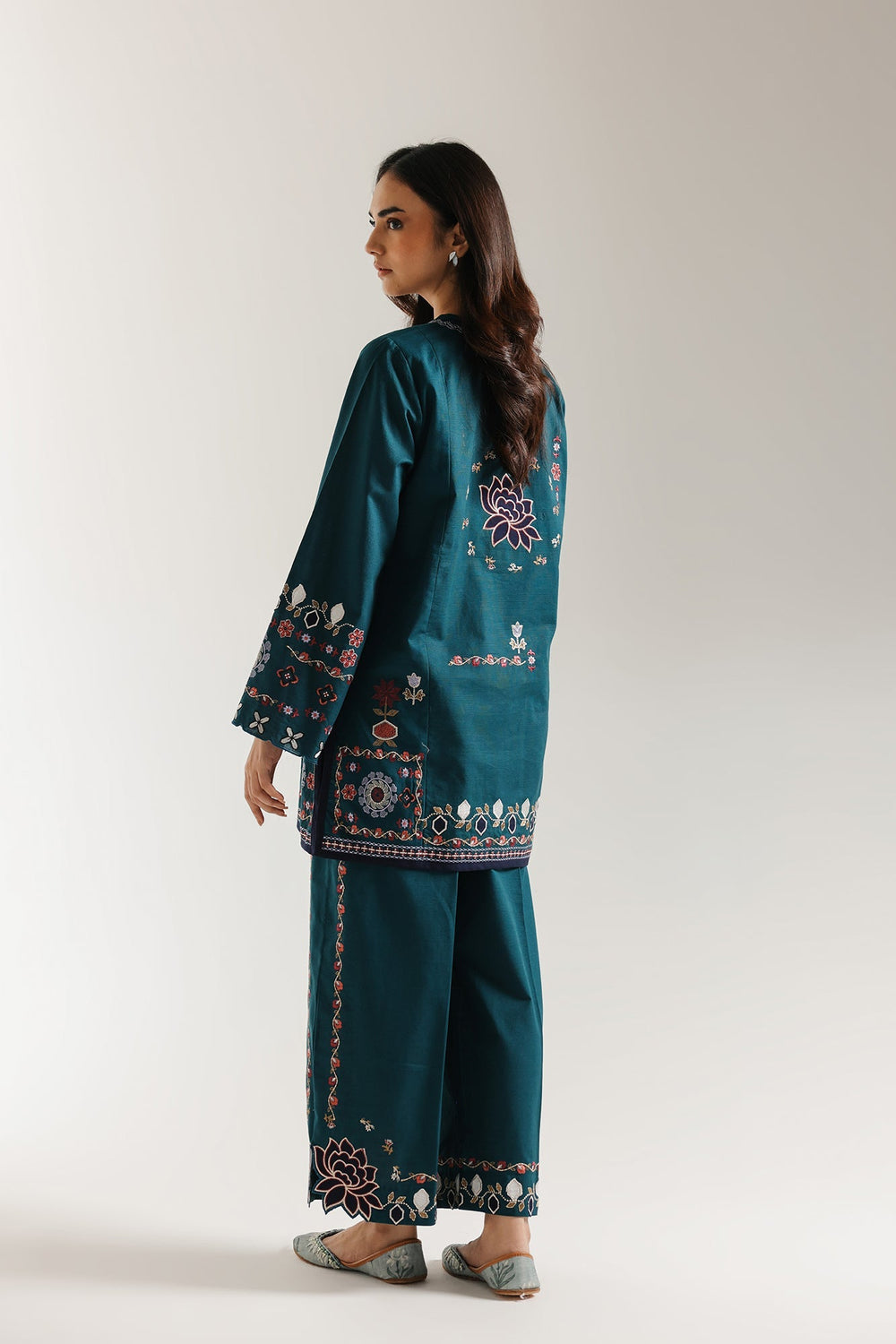 Unveil the deep, opulent charm of this mesmerizing teal embroidered suit. The short, straight-cut kurta is crafted from a rich, deep teal fabric that serves as a striking backdrop for the intricate floral thread embroidery. The vibrant motifs, featuring stylized flowers and patterns in shades of deep rose, green, and white, are concentrated around the V-slit neckline and lavishly border the wide sleeves and hem. The ensemble is completed by coordinating culotte trouser in the same rich teal, featuring matching embroidery and intricate borders near the hem, creating a perfectly balanced and festive traditional look.