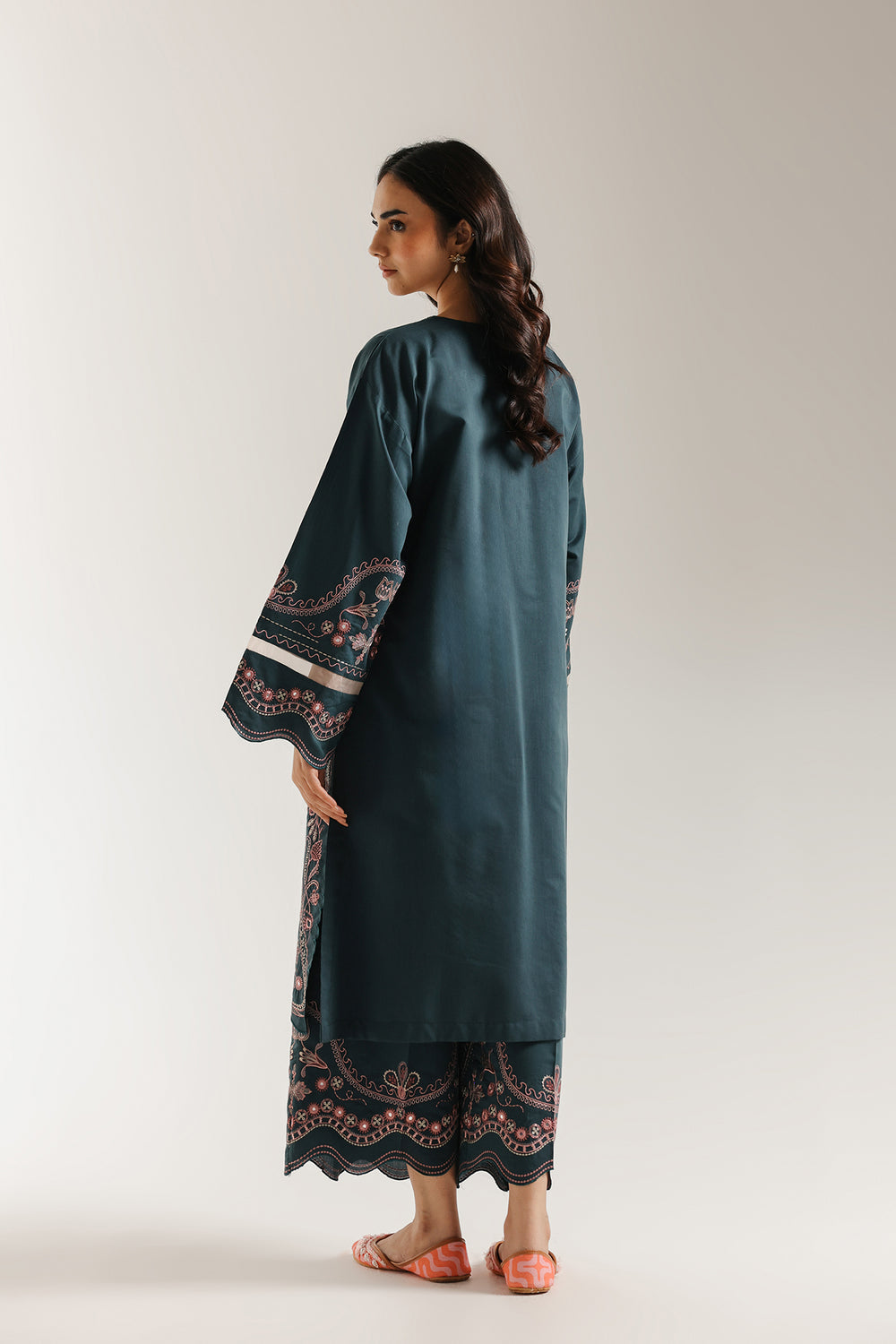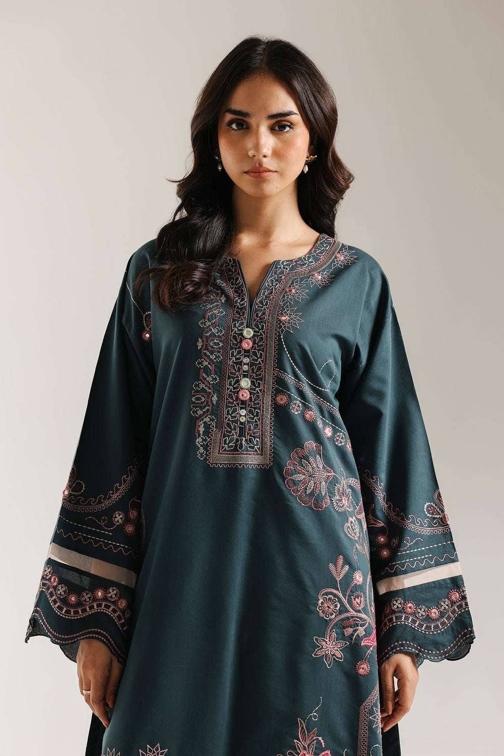 Immerse yourself in the deep, luxurious tones of this stunning embroidered suit. The long, straight-cut kurta is crafted from a rich, dark teal/pine green fabric. It is lavishly adorned with bold floral and geometric thread embroidery in vibrant pink, magenta, and subtle white hues. The embroidery details the neckline, runs down the front panel, and highlights the wide, straight sleeves. The ensemble is completed by coordinating trouser in the same deep teal color, featuring matching intricate floral embroidery along the hem. This suit delivers a sophisticated and festive traditional statement.