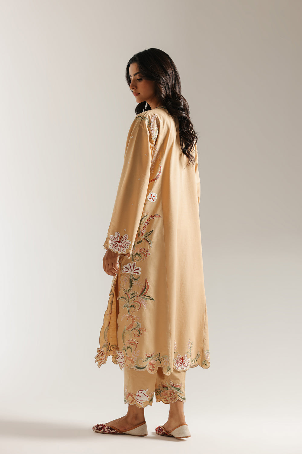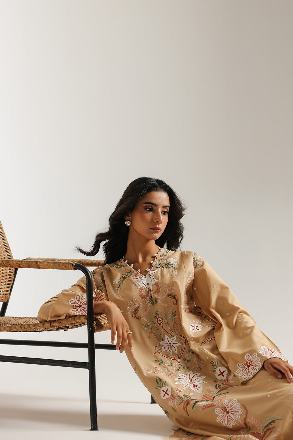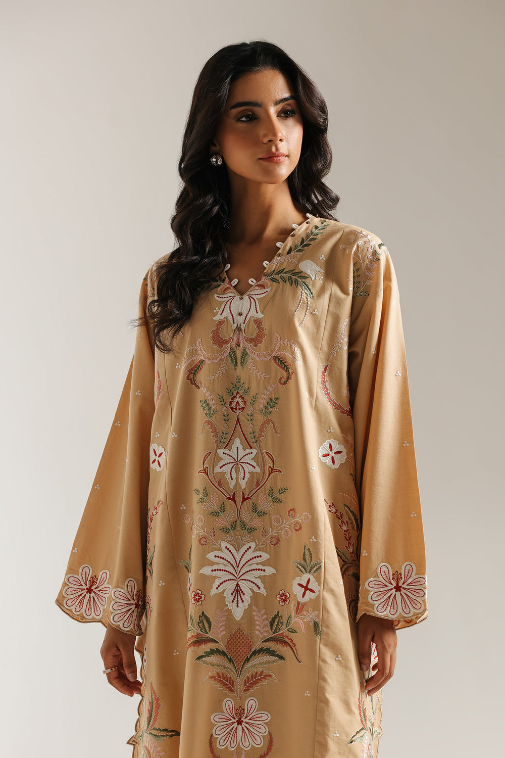 Immerse yourself in the timeless elegance of this stunning embroidered suit. This two-piece ensemble is a true masterpiece of intricate design. The beautiful, muted peanut base of the long shirt serves as a graceful canvas for the beautiful floral and geometric embroidery in a captivating palette of white, off-white, and red. The detailed threadwork and subtle embellishments on the neckline create a truly mesmerizing look. The suit is completed with matching straight fit trousers, making it an ideal choice for any formal gathering.
