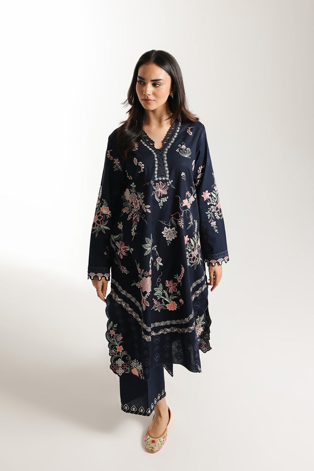 Capture deep, feminine elegance with this stunning navy blue embroidered suit. The straight-cut kurta is lavishly detailed with traditional floral and vine embroidery in soft shades of pink, dusty rose, and green that cascade down the front and sleeves. The elaborate neckline is highlighted with fine stitching, and the hem is beautifully finished with a delicate embroidered pattern that features circular motifs. The ensemble is perfectly completed by tailored trousers that feature subtle embroidered accents at the cuff, creating a graceful, luxurious, and cohesive look.