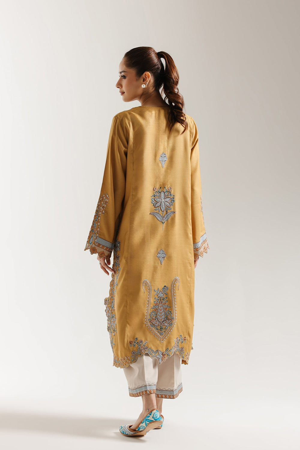 Step into earthy sophistication with this exquisite embroidered suit in light mustard tones. The straight kurta, crafted in a rich olive green hue, is beautifully adorned with intricate blue and ivory embroidery featuring detailed floral patterns that flow gracefully down the front, across the wide statement sleeves, and along the scalloped hemline. The back is elegantly embroidered, adding to its refined charm. The ensemble is perfectly paired with contrasting white culotte trousers, featuring a striking wide border of matching floral and geometric embroidery at the hem — creating a balanced and effortlessly graceful traditional look.