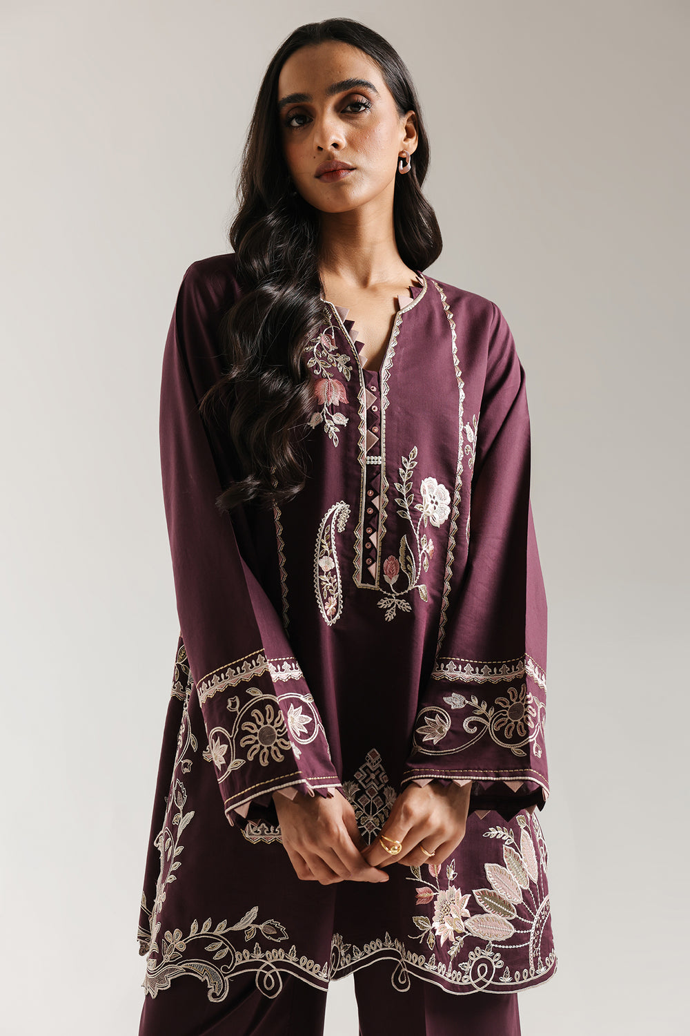 Wrap yourself in the luxurious depth of this gorgeous embroidered suit. This stunning ensemble features a short-length kurti and matching straight trousers crafted in a deep, rich plum fabric. The shirt is elegantly adorned with intricate white and light pink embroidery in beautiful floral and paisley motifs, highlighting the centre front and the entire hemline. It features a flattering V-neckline, and the wide sleeves are finished with a delicate embroidered border. The coordinating trouser carry the same ornamental embroidery along the hem, creating a cohesive and regal monochrome look.