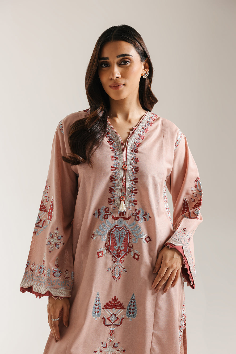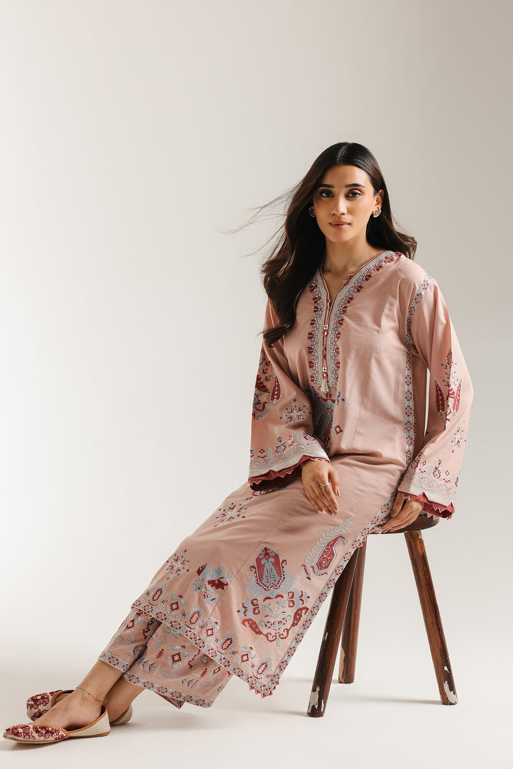Immerse yourself in the gentle romance of this soft pink embroidered suit. The long, straight-cut kurta is beautifully embellished with exquisite, symmetrical thread embroidery. The detailed traditional motifs, executed in delicate shades of blue, sage green, and muted red, cascade down the front and wide sleeves. The V-slit neckline features fine border detailing and decorative tassels, adding a lovely, handcrafted touch. The ensemble is perfectly completed by coordinating trouser that carry matching embroidered details at the hem, creating a polished, graceful, and feminine traditional look.