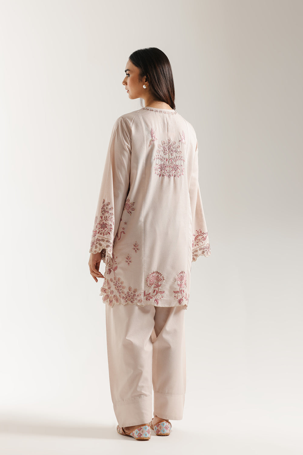 Unveil your soft, sophisticated side with this dreamy blush embroidered suit. The short, A line kurta is crafted from cotton viscose fabric and features delicate pink embroidery in stylized floral and bird motifs that gracefully adorn the neckline, hem, and cuffs of the wide, flowing sleeves. The neckline is elegantly finished with white stitch detailing. The ensemble is perfectly matched with relaxed wide leg shalwar in the same gentle hue, creating a harmonious and utterly refined traditional look.
