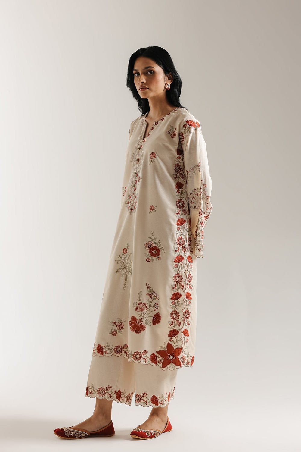 Wrap yourself in radiant, festive elegance with this exquisite embroidered suit. This stunning ensemble features a long-length shirt and matching straight-fit trouser crafted in a smooth, luxurious pale cream fabric. The shirt is richly adorned with vibrant red-orange embroidery in stylized floral and vine motifs, which prominently highlights the round yoke and flows gracefully down the length of the shirt. It features a round neckline, and the wide sleeves are finished with a beautiful, scalloped and embroidered cuff. The coordinating trouser carry the same decorative red-orange embroidery along the hem, creating a cohesive and beautifully traditional look.