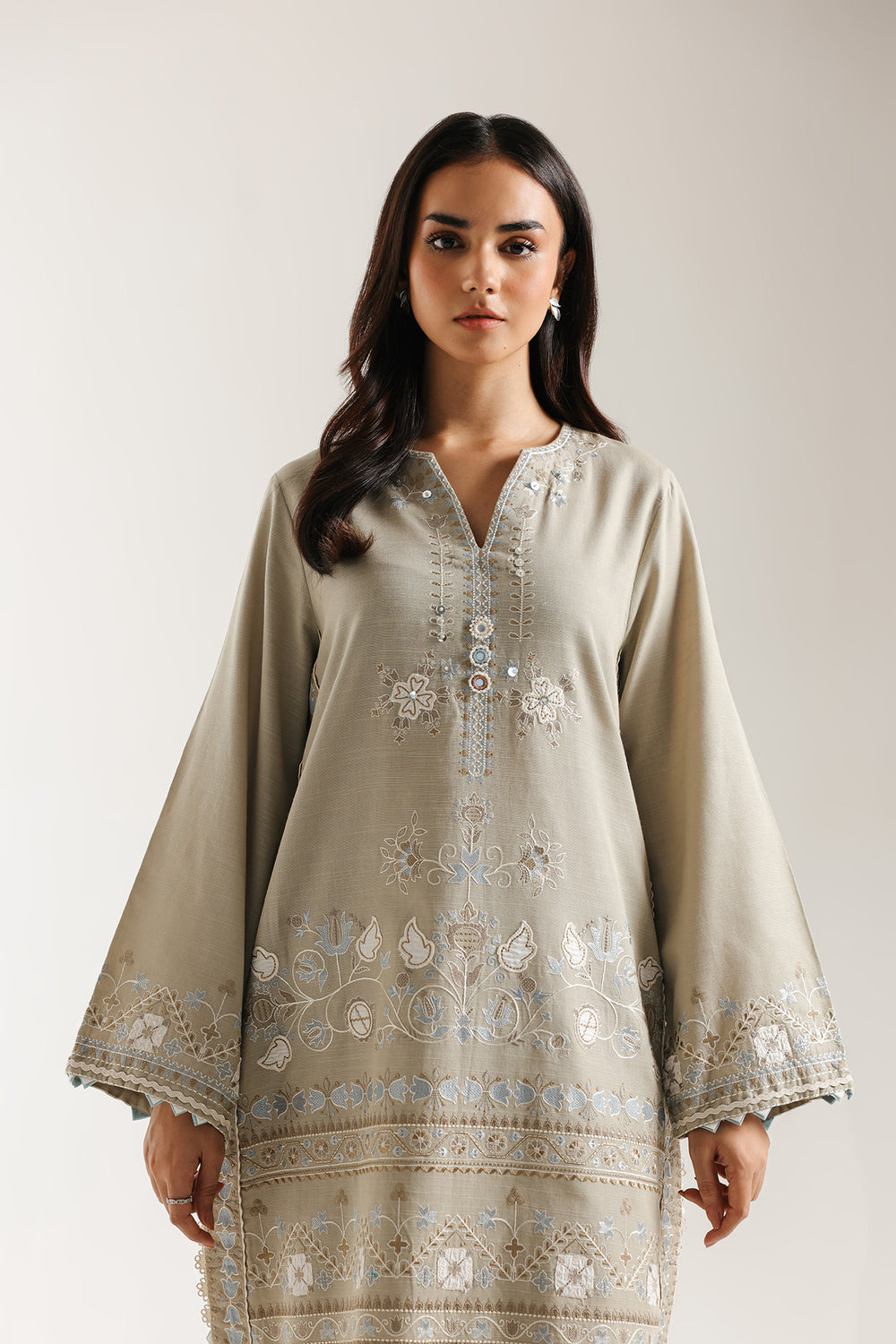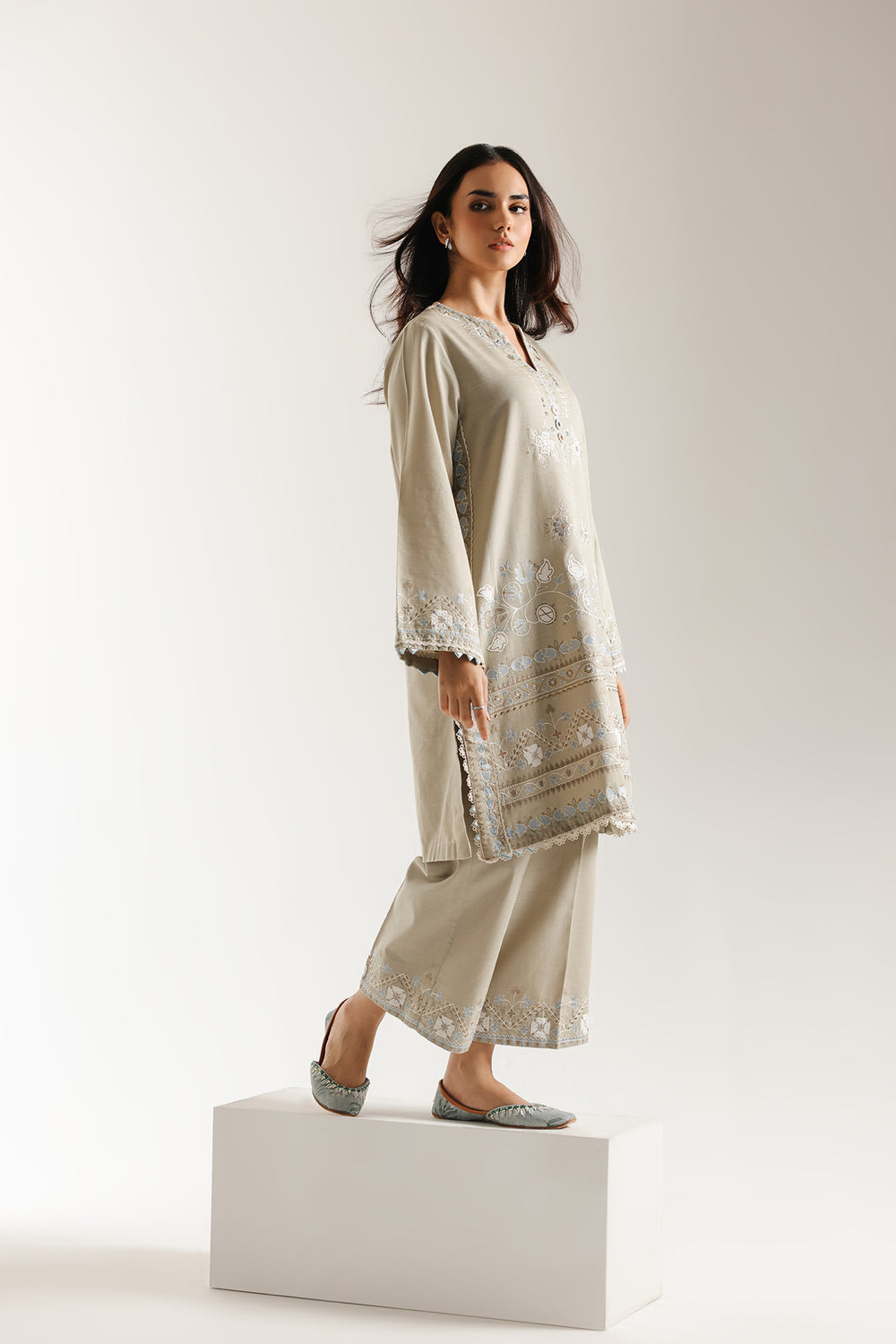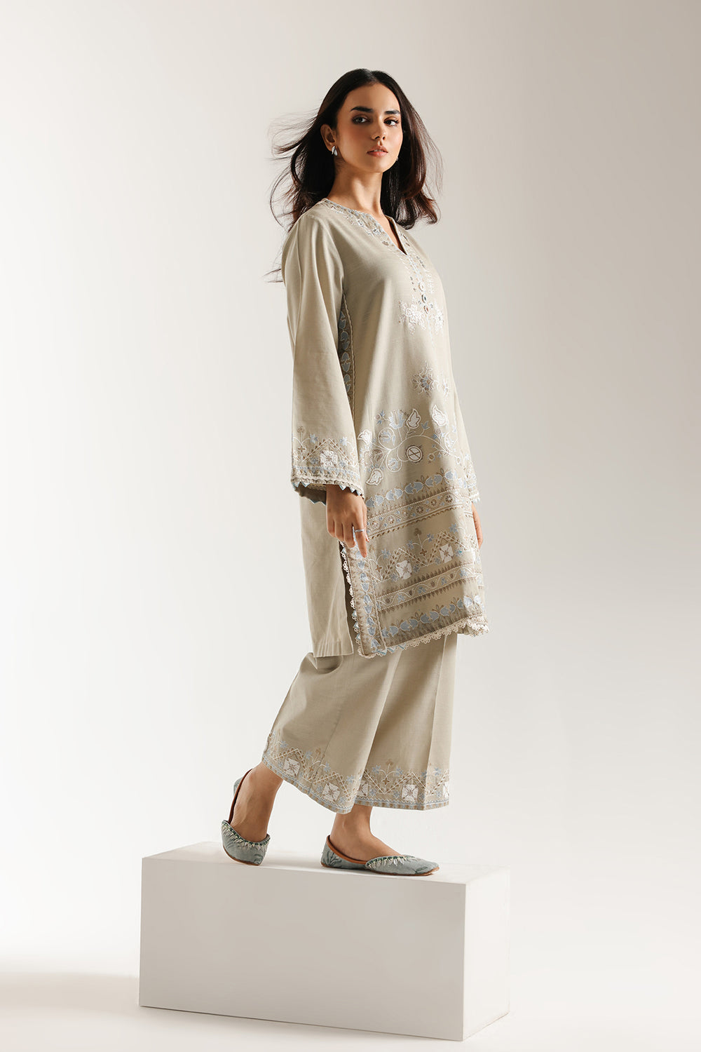 Bask in serene elegance with this stunning dove grey embroidered suit. The straight-cut kurta is crafted from a comfortable fabric in a stone grey hue and is beautifully adorned with intricate white and light blue thread embroidery. The embroidery features delicate floral and vine motifs that symmetrically cascade down the front, with beautiful border patterns encircling the hem and cuffs. The traditional V-slit neckline is accented with fine stitching. The ensemble is perfectly completed by comfortable, wide-leg trouser that feature matching embroidered borders and lace trim at the hem, creating a graceful, refined, and effortlessly chic traditional look.