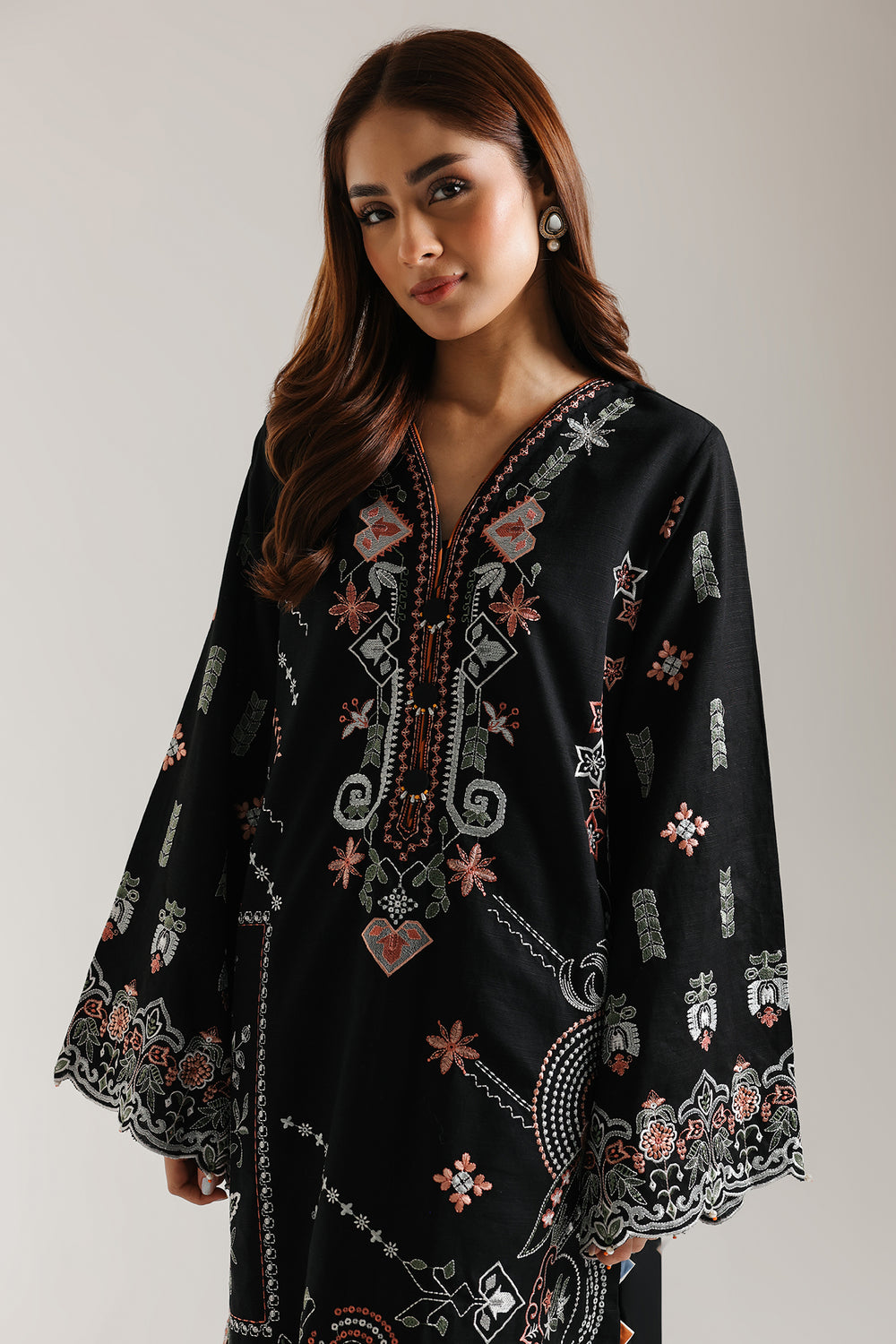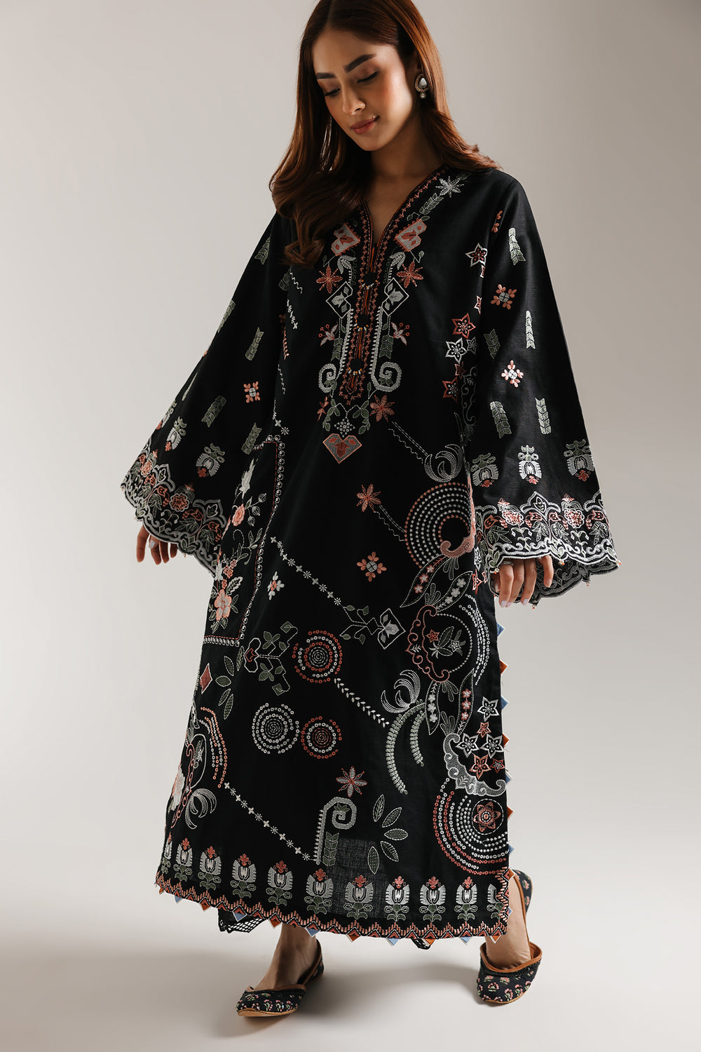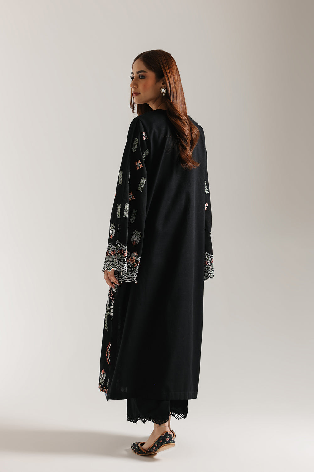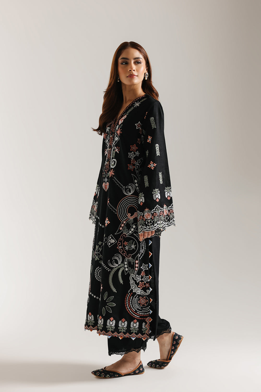 Experience the refined elegance of traditional artistry with this meticulously crafted embroidered suit. The ensemble features a striking black long shirt adorned with elaborate floral embroidery in coral, peach and white tones that gracefully adorns the front panel. Each stitch reflects generations of skilled craftsmanship, with stylised botanical motifs creating visual depth and movement. The coordinating trousers echo the shirt's design through delicate cutwork detailing at the hem, ensuring a cohesive, polished appearance. Ideal for everyday gatherings and special events, this two-piece composition merges contemporary silhouette with heritage embroidery techniques for an unforgettable statement.