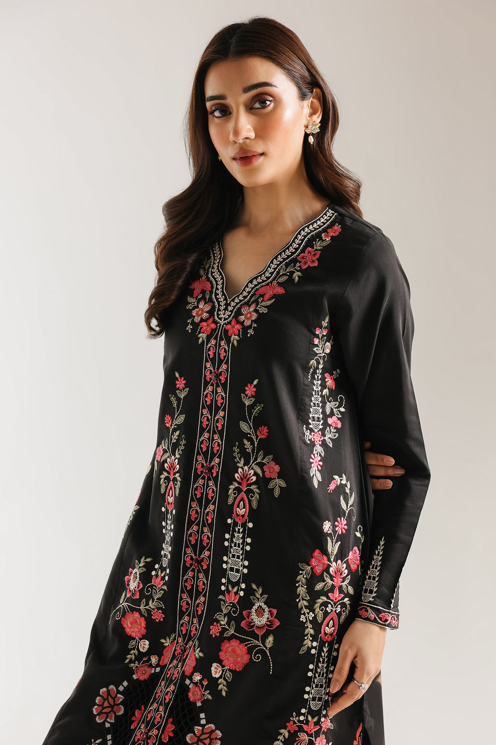 Make a striking and sophisticated statement with this black featuring a longline shirt and matching trousers adorned with vibrant floral embroidery. The shirt is designed with a graceful V-neckline and a full-length vertical embroidered panel that elongates the silhouette, showcasing intricate blossoms in rich shades of pink, red, and sage green. Detailed botanical sprays bloom across the front and sleeves, while the scalloped hemline is finished with a larger floral border and delicate linear stitching for an artisanal touch. Paired with sleek black trousers, this ensemble perfectly balances traditional needlework with a modern, streamlined fit.