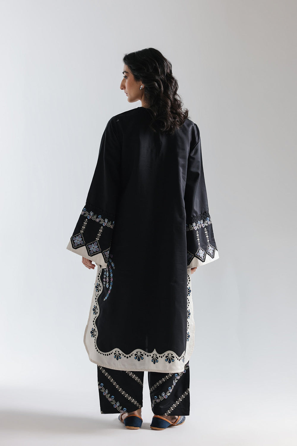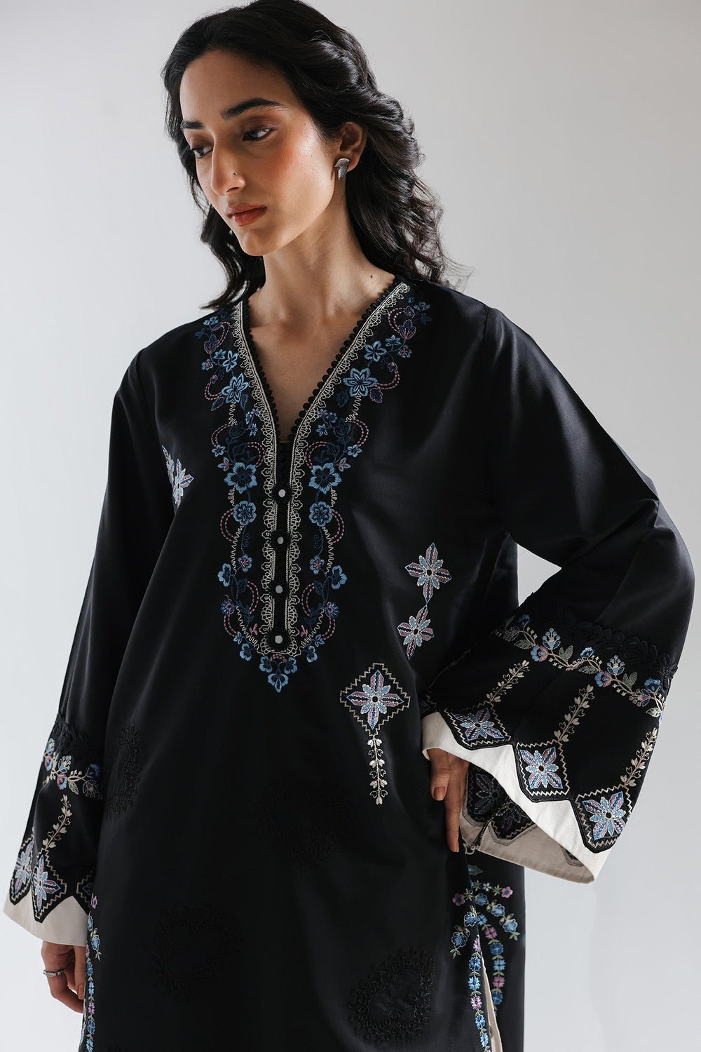 Step into a world of sophisticated elegance with this striking two-piece embroidered suit, where deep midnight black serves as the perfect canvas for cool-toned artistry. The long-sleeved shirt is defined by a graceful V-neckline, intricately adorned with layered blue and lilac floral embroidery that frames a delicate buttoned placket. Its dramatic wide sleeves and hemline feature a high-contrast ivory border, shimmering star-like motifs, and lush botanical threadwork that adds a touch of ethereal charm. Completing the ensemble is matching black shalwar, beautifully detailed with diagonal vine-like embroidery that mirrors the floral theme of the shirt. This ensemble offers a commanding yet feminine silhouette, making it an exquisite choice for evening soirées and formal festive gatherings.
