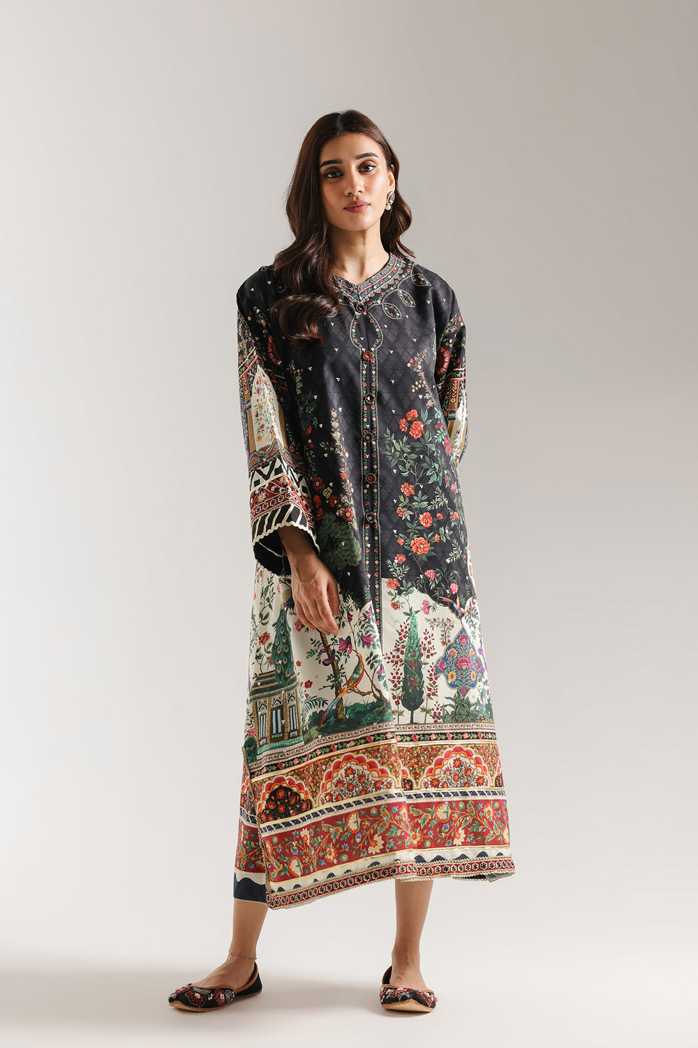 Make a dramatic and artistic statement with this jet-black longline kaftan, featuring an A-line silhouette and a vibrant, multi-layered digital print. The design is characterized by a high round neckline and a central buttoned placket, showcasing a picturesque landscape of lush gardens, architectural elements, and exotic birds in rich shades of emerald green, ruby red, and ochre. This intricate scene transitions from a dark, floral-scattered upper half into a bright ivory lower panel, all framed by dense geometric and floral borders along the wide sleeves and hemline. With its floor-length drape and storytelling print, this piece offers a perfect blend of modern sophistication and classic Eastern aesthetics.