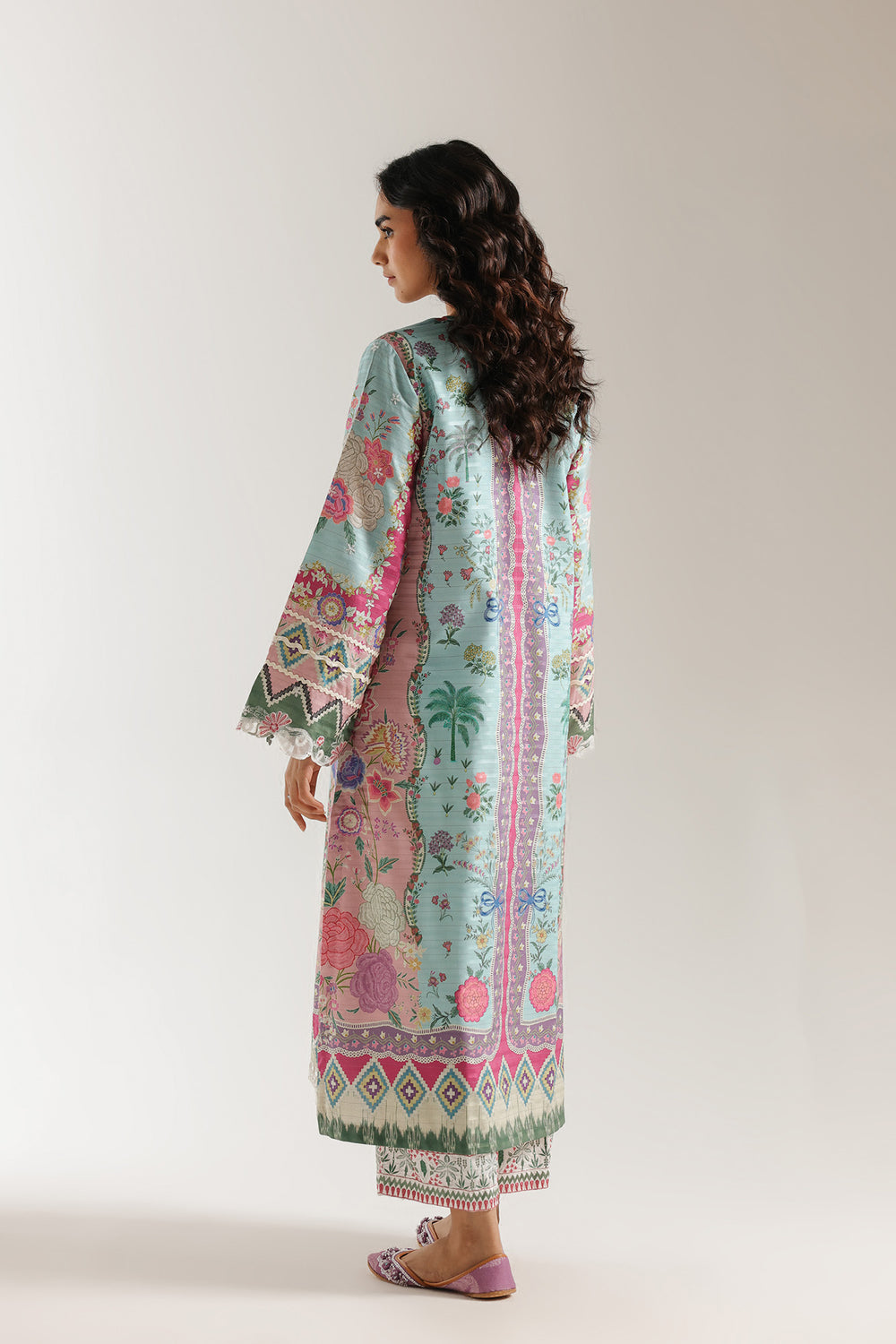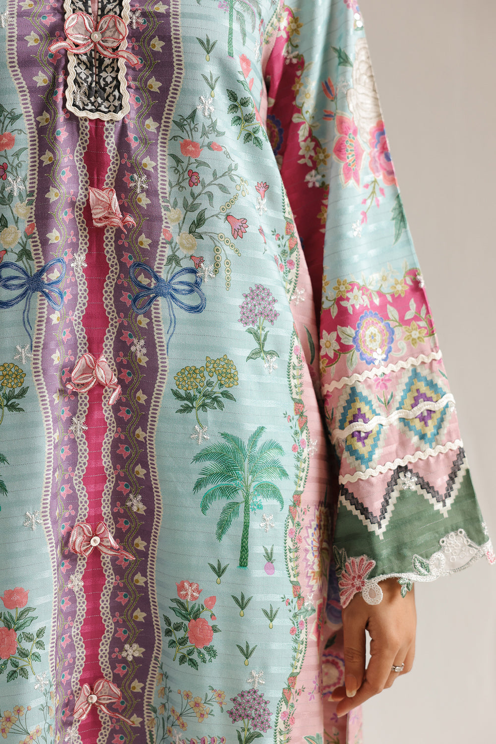 Elevate your summer wardrobe with this striking embroidered suit featuring a captivating palette of icy blue and magenta that commands attention. The kameez showcases exquisite white lace trim along the hemline and sleeves—a hallmark of refined craftsmanship that adds sophisticated femininity to the printed fabric. Designed with a straight, relaxed silhouette paired with cropped printed trousers, this ensemble strikes the perfect balance between contemporary style and semi-formal elegance.