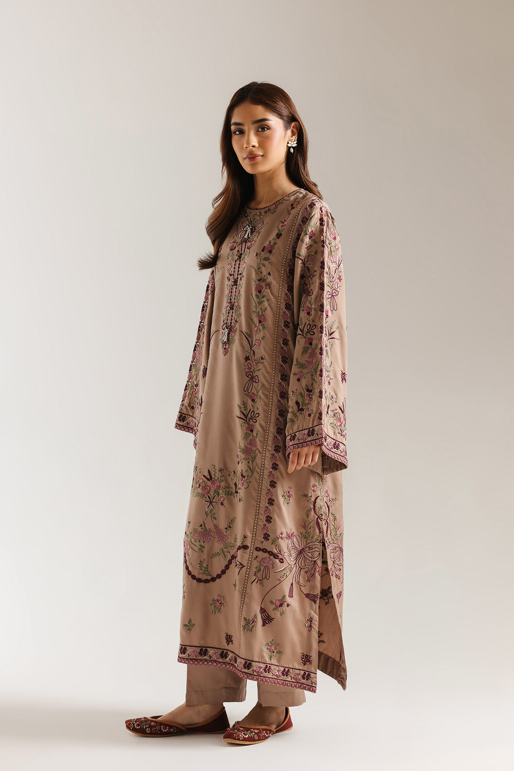 This graceful two-piece suit is rendered in a sophisticated taupe shade, featuring a long-length A-line shirt that drapes elegantly. The garment is adorned with delicate pink and mauve floral embroidery that cascades vertically down the front and extends along the voluminous flared sleeves. A decorative beaded placket and intricate border detailing at the hem and cuffs add a refined touch, while the matching straight-cut trousers complete this harmonious and timeless ensemble.