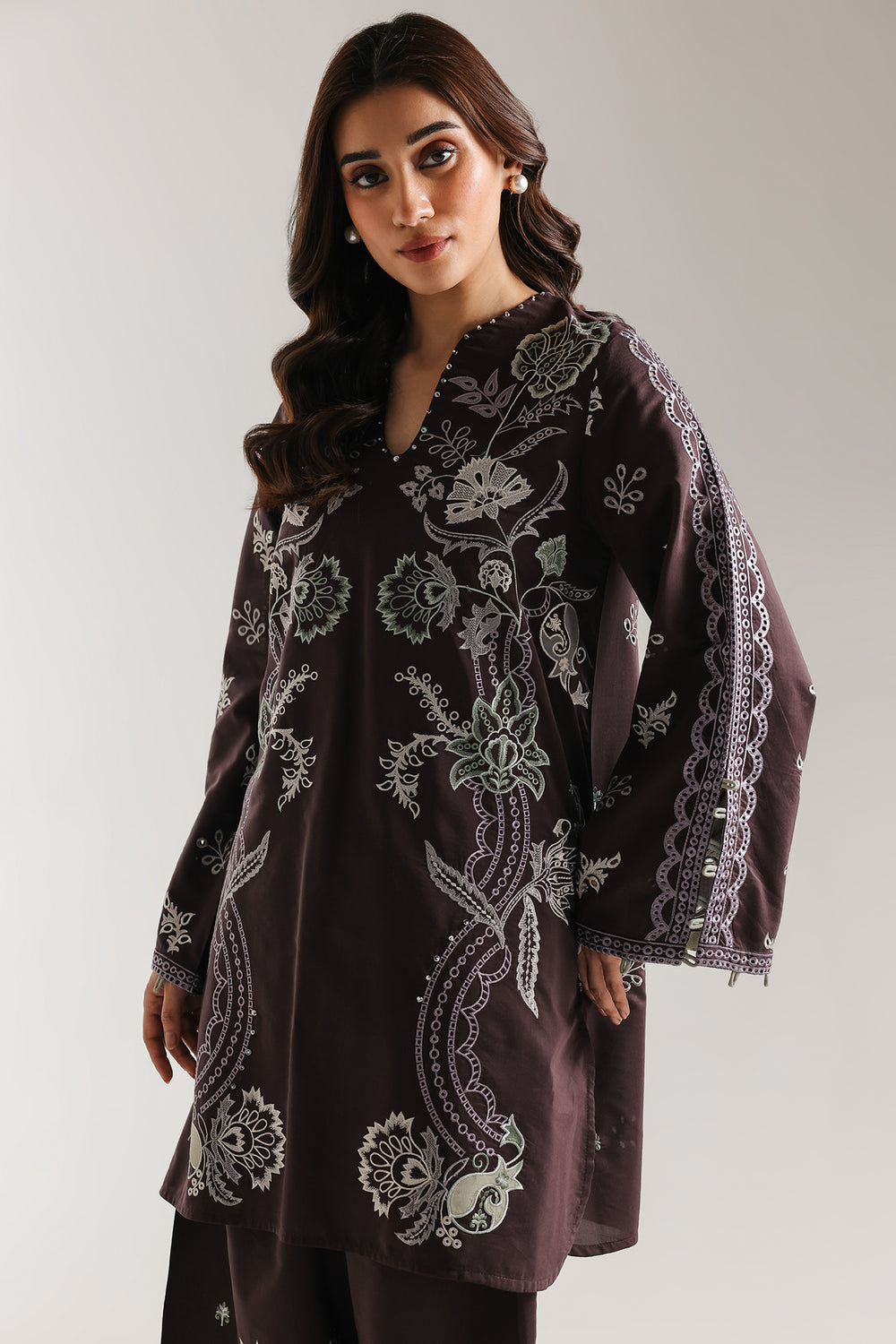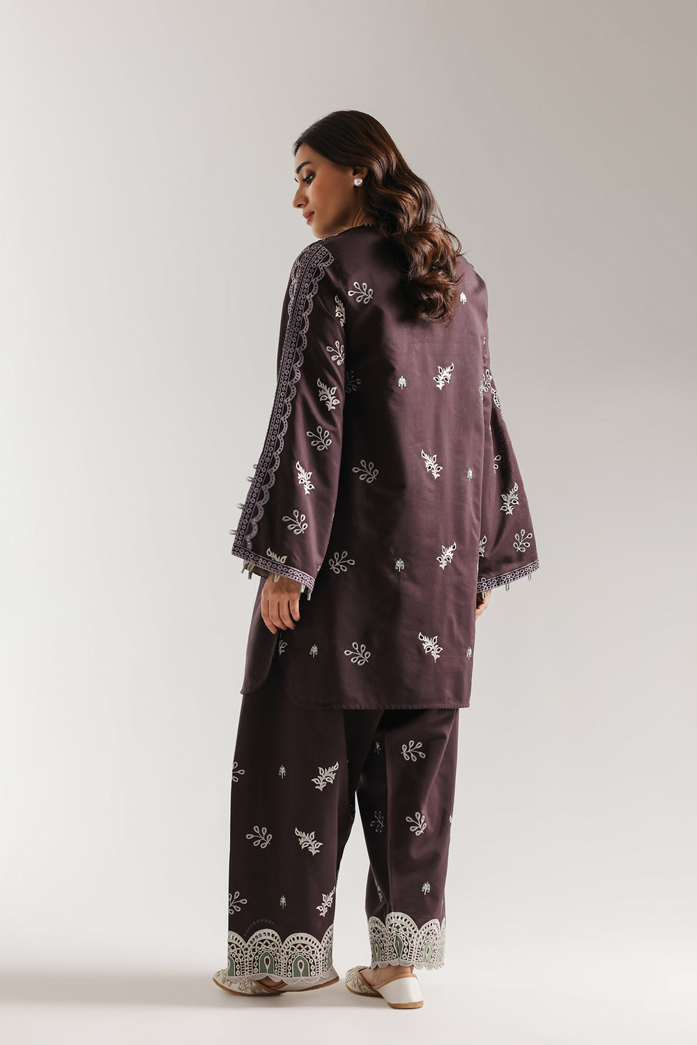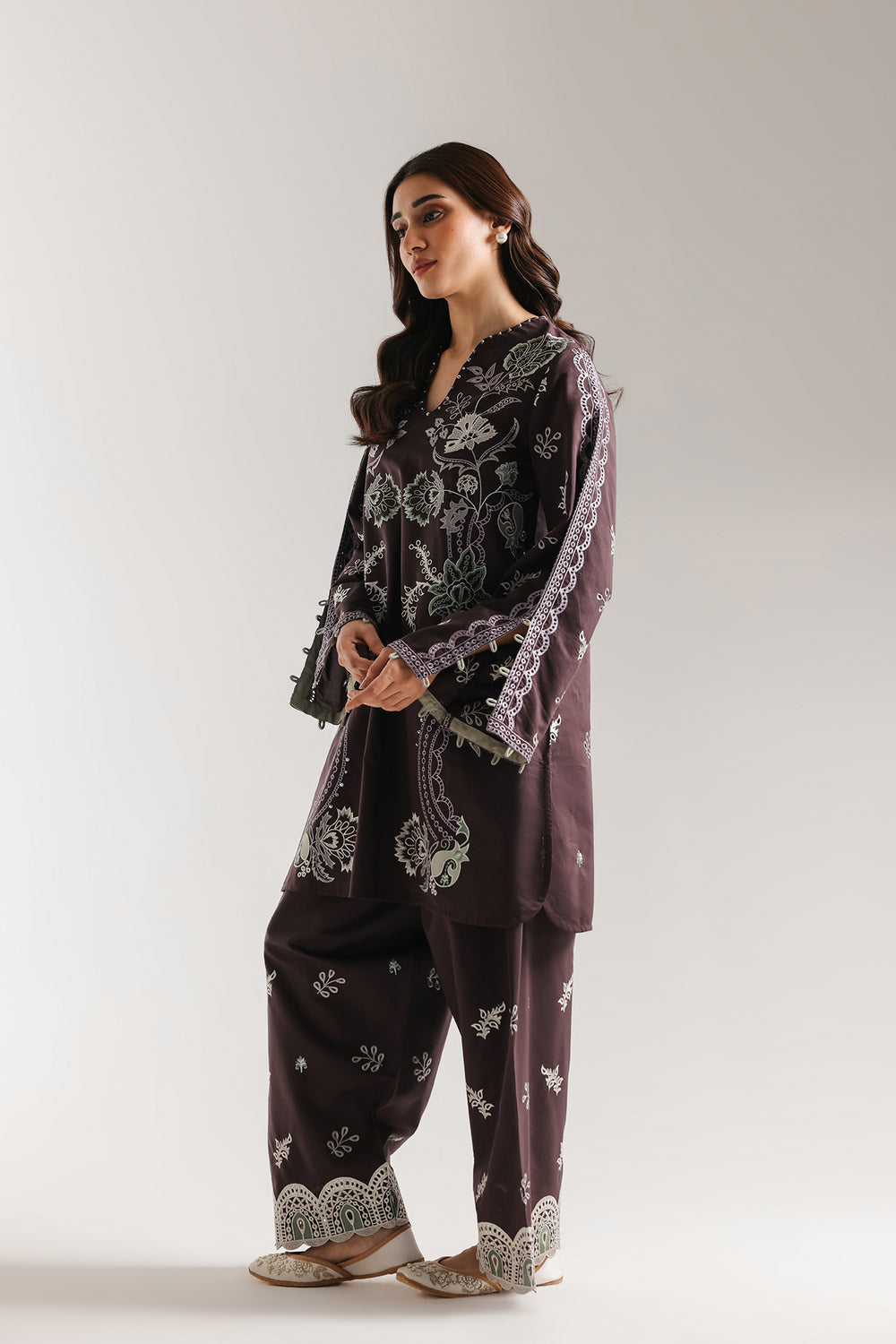 This striking deep plum embroidered suit for women exudes regal sophistication with its rich, deep hue. The elegant tunic features a refined slit-neckline and intricate floral embroidery across the front, perfectly complemented by a matching wide leg shalwar. It is a stunning, high-contrast choice for any formal festive celebration.