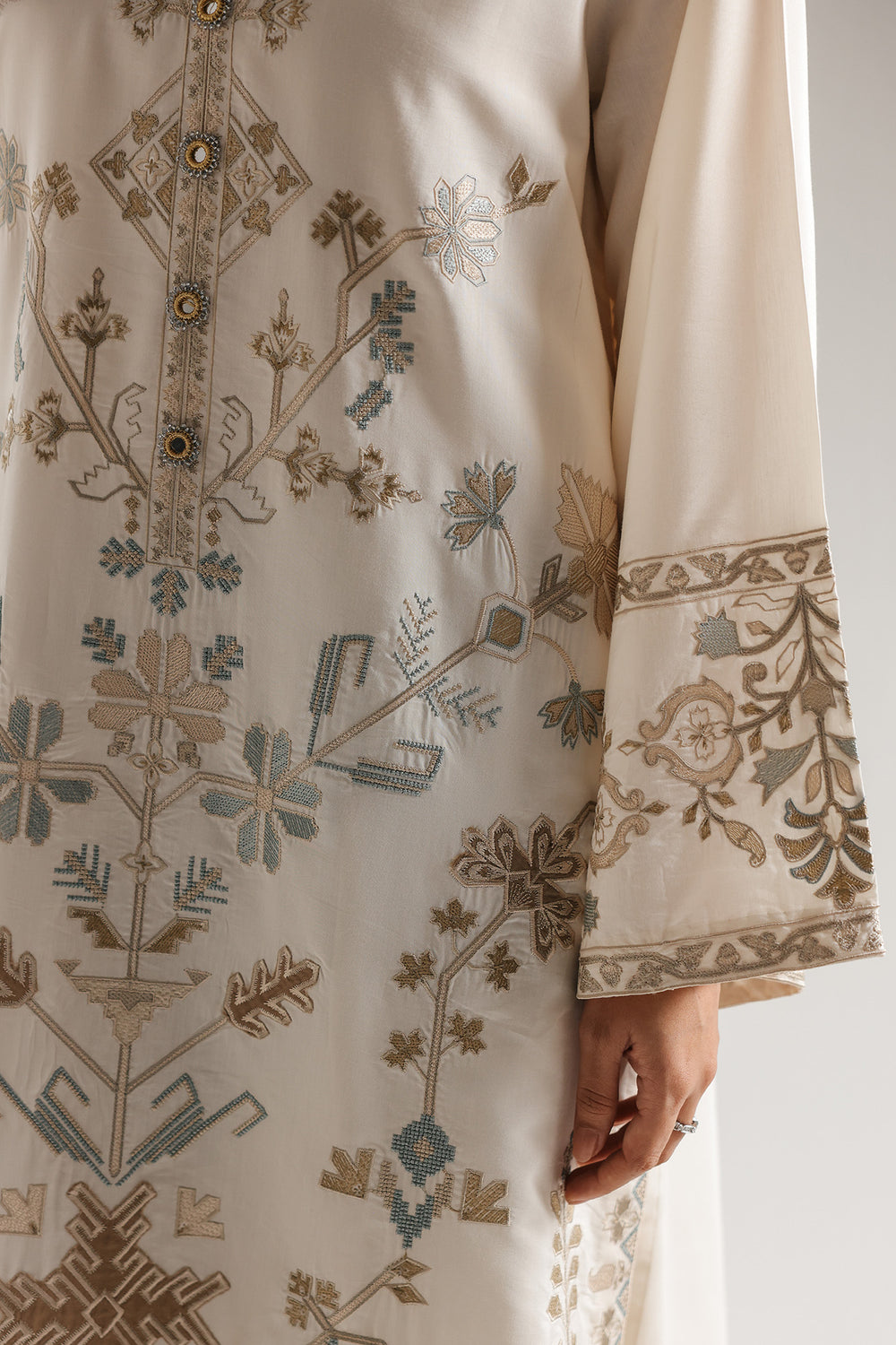 Make a serene and sophisticated statement with this stone-colored two-piece suit, featuring a longline shirt and matching trousers adorned with tonal embroidery. The shirt is designed with a refined V-neckline and a central buttoned placket, showcasing intricate geometric and botanical needlework that cascades down the front in soft shades of grey, beige, and muted blue. This artistic craftsmanship extends to the wide sleeves and the hemline, which features a dense ornamental border and a delicate scalloped edge for an elegant finish. Paired with straight-fit trousers that mirror the embroidered details at the cuffs, this ensemble offers a perfectly balanced look of traditional artistry and modern grace.