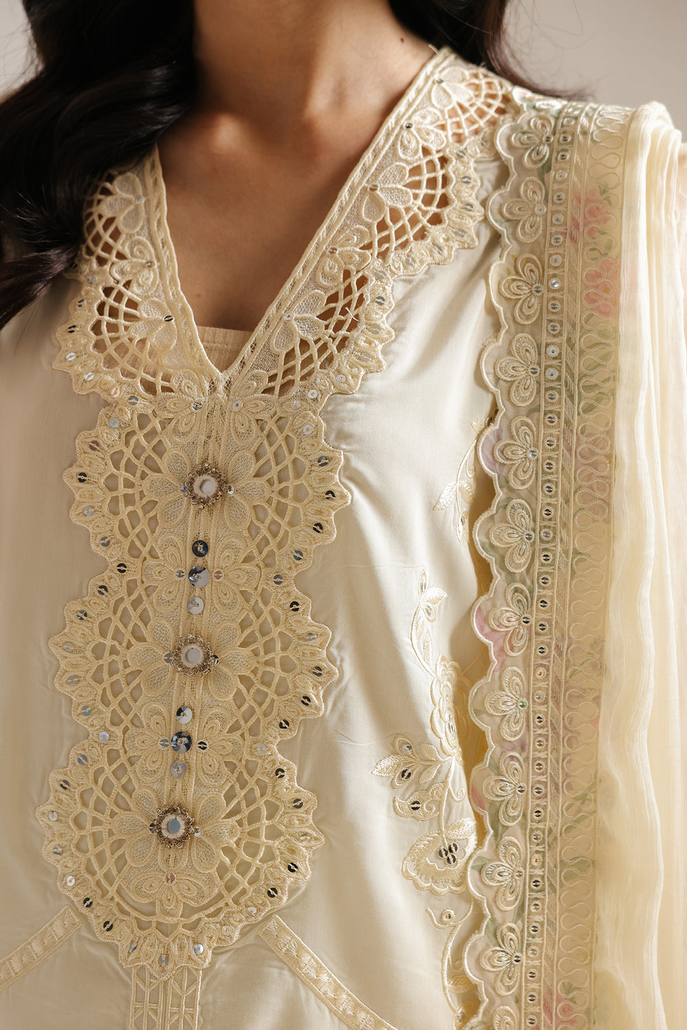 Step into a world of ethereal beauty with this stunning three-piece ensemble, rendered in a luminous pale buttermilk ivory that glows with soft elegance. The sleeveless shirt features a deep, sophisticated V-neckline, lavishly framed by a broad, cream-toned embroidered yoke. The bodice serves as a canvas for tonal storytelling, showcasing dense vertical panels of geometric lace and climbing botanical vines that stretch toward a majestic, heavily embroidered hemline. The look is harmoniously elevated by a matching sheer dupatta, featuring a vibrant floral-embroidered border and a delicate scalloped lace finish that adds a soft, feminine weight to the ensemble. The outfit is completed with coordinating trouser, finished with a broad, intricate lace border at the ankles for a polished, regal silhouette. Perfect for sun-drenched daytime festivities or grand celebrations, this suit offers a presence that is both timeless and undeniably opulent.