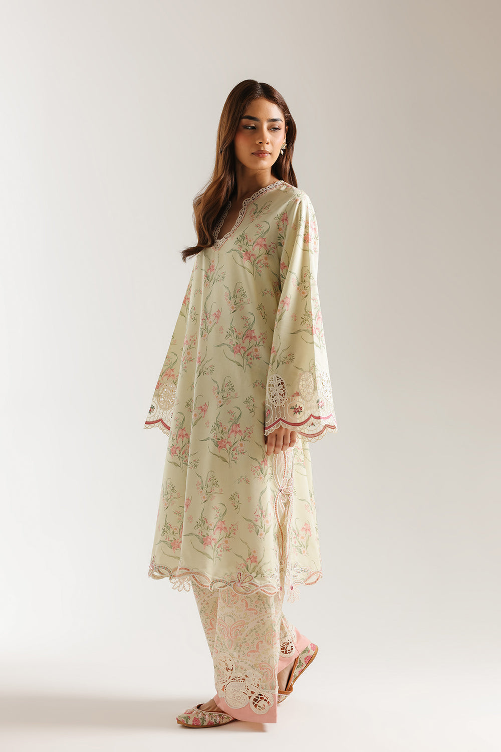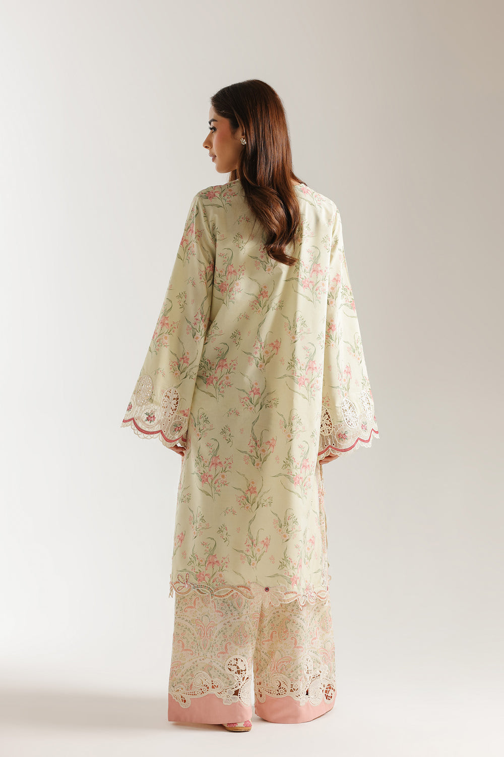 Embrace a harmonious blend of nature-inspired tones and heritage craft with this pale-yellow two-piece suit, featuring a longline shirt and coordinated printed trousers. The shirt is designed with a sleek split U-neckline and long wide sleeves, showcasing soft pastel floral embroidery that trails elegantly across the front. Intricate embroidered borders also accent the cuffs and the hemline, adding a refined touch to the earthy tone of the fabric. This top is paired with voluminous, wide-leg shalwar featuring an all-over matching print, creating a rich and cohesive pattern.