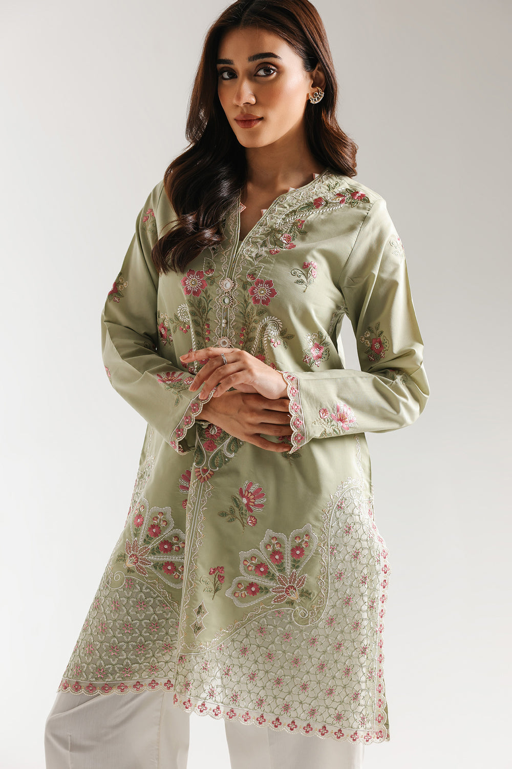 Radiate fresh, springtime elegance in this two-piece embroidered suit in a soft pistachio green hue. The shirt features a sophisticated V-neckline and is lavishly adorned with delicate pink floral embroidery and intricate white lace-like patterns that cascade down to a beautifully scalloped hem. Paired with crisp white wide-leg trouser finished with subtle tonal embroidery, this ensemble is a perfect choice for refined daytime gatherings.