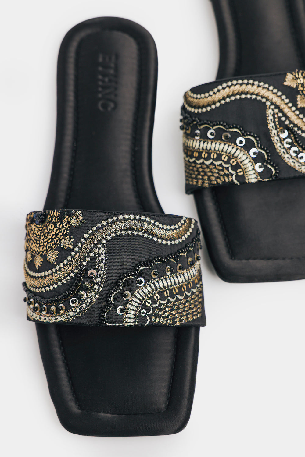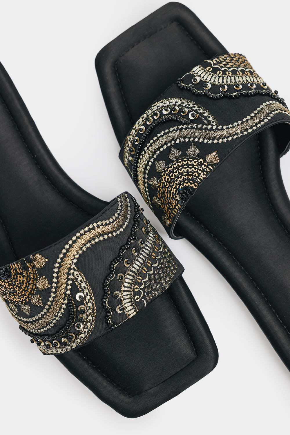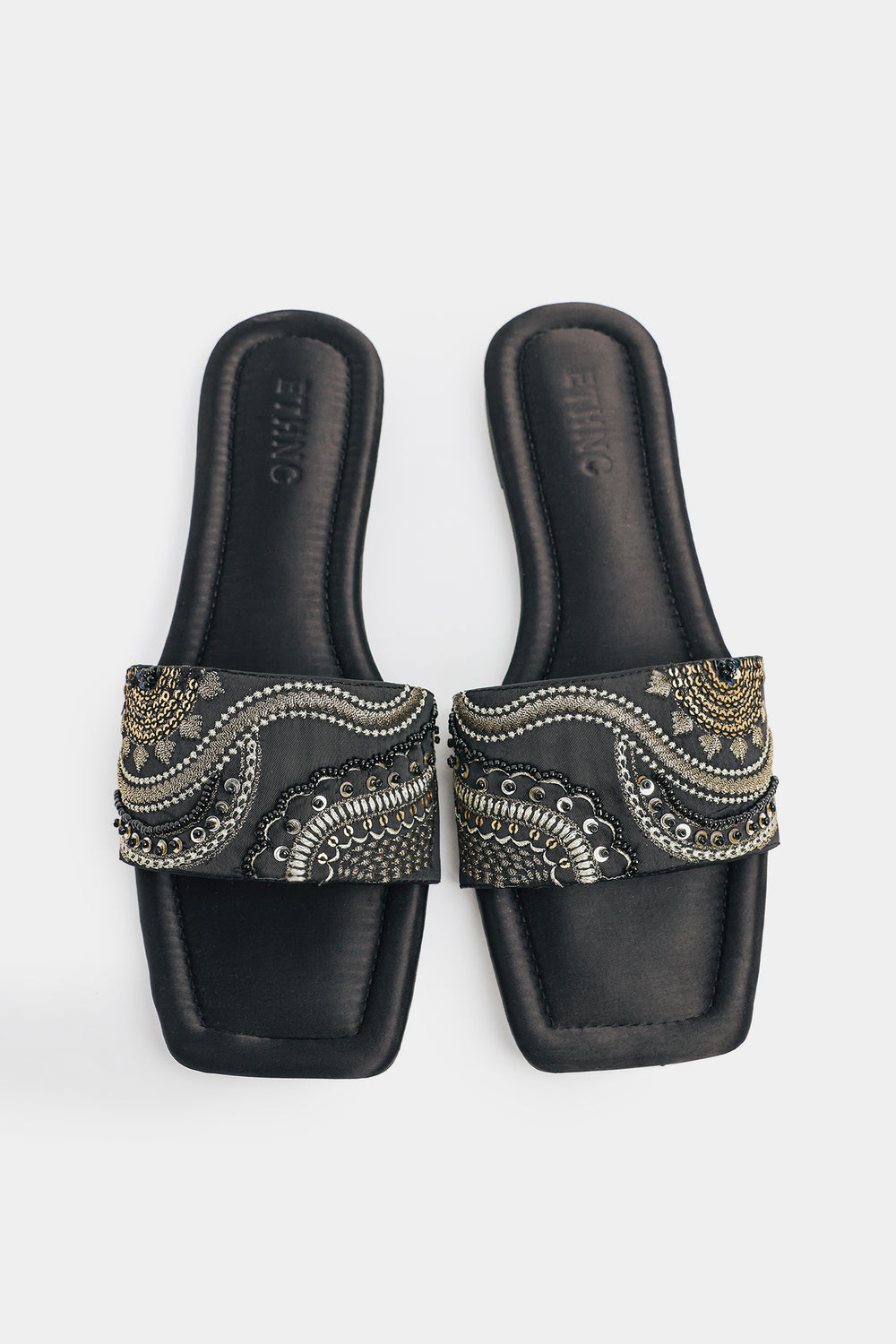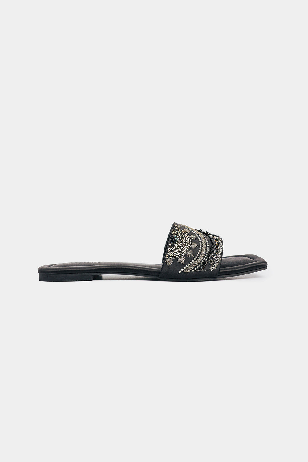 Shimmer and shine with every step in these classic black slides, featuring a wide strap lavishly adorned with glittering rectangular rhinestones. The subtle metallic sheen of the satin material perfectly complements the sparkling embellishments, making these the ideal choice for adding effortless glamour to any ensemble, from a casual chic look to a festive occasion.