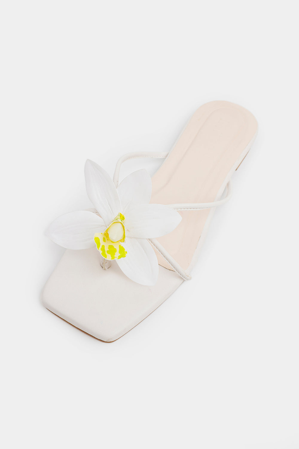 This sophisticated sandal showcases a delicate white floral embellishment paired with a distinctive cross-strap design. The cross-strap construction provides secure support, while the intricate flower detailing elevates the aesthetic with refined elegance. Crafted for comfort and style, this piece seamlessly transitions from everyday wear to special occasions. The botanical accent adds a touch of femininity and artisanal charm, making it a versatile addition to any wardrobe seeking understated luxury.