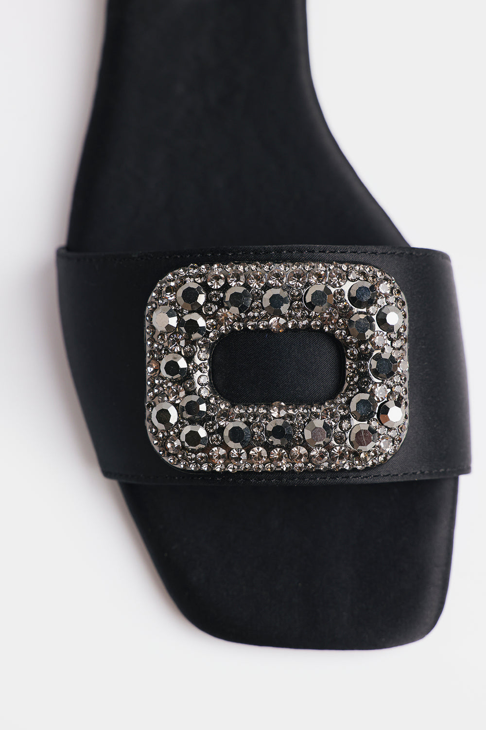 Add a touch of sophisticated glamour to your ensemble with these sleek black slide sandals, featuring a minimalist single-strap design. The broad front strap is crafted from a smooth, matte material and serves as a base for a striking, oversized rectangular buckle. This statement buckle is densely encrusted with shimmering charcoal and silver-toned crystals, offering a refined sparkle that elevates the footwear. Designed with a comfortable flat sole and a cushioned insole featuring subtle branding, these sandals perfectly balance style and ease. They are a versatile choice that can seamlessly transition from a polished daytime look to a more formal evening outfit.
