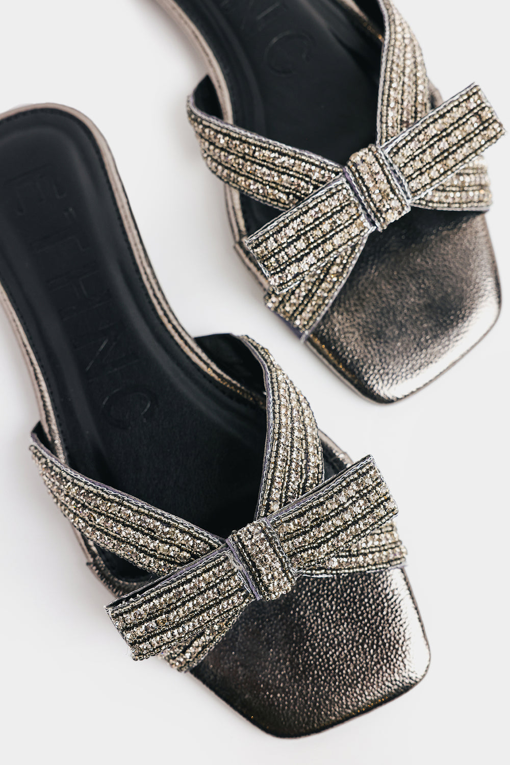 Step into shimmer and sass with these show-stopping slides! Featuring a sleek metallic pewter finish with a textured cracked-leather footbed, they're anything but ordinary—a jaw-dropping multi-layered bow adorned with densely packed shimmering crystals that catch light from every angle. The modern square-toe silhouette keeps things contemporary and cool, while the padded black footbed ensures all-day comfort. Perfect for elevating your casual looks with a touch of sparkle and personality.