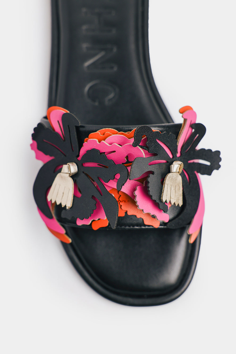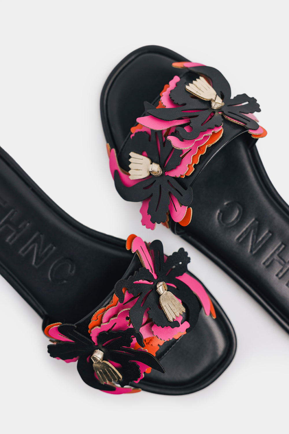 These black slip-on sandals feature a unique floral pattern in vibrant pink and black, accented with embroidered flowers. The perfect combination of comfort and style, these sandals are sure to make a statement wherever you go. Step into luxury.