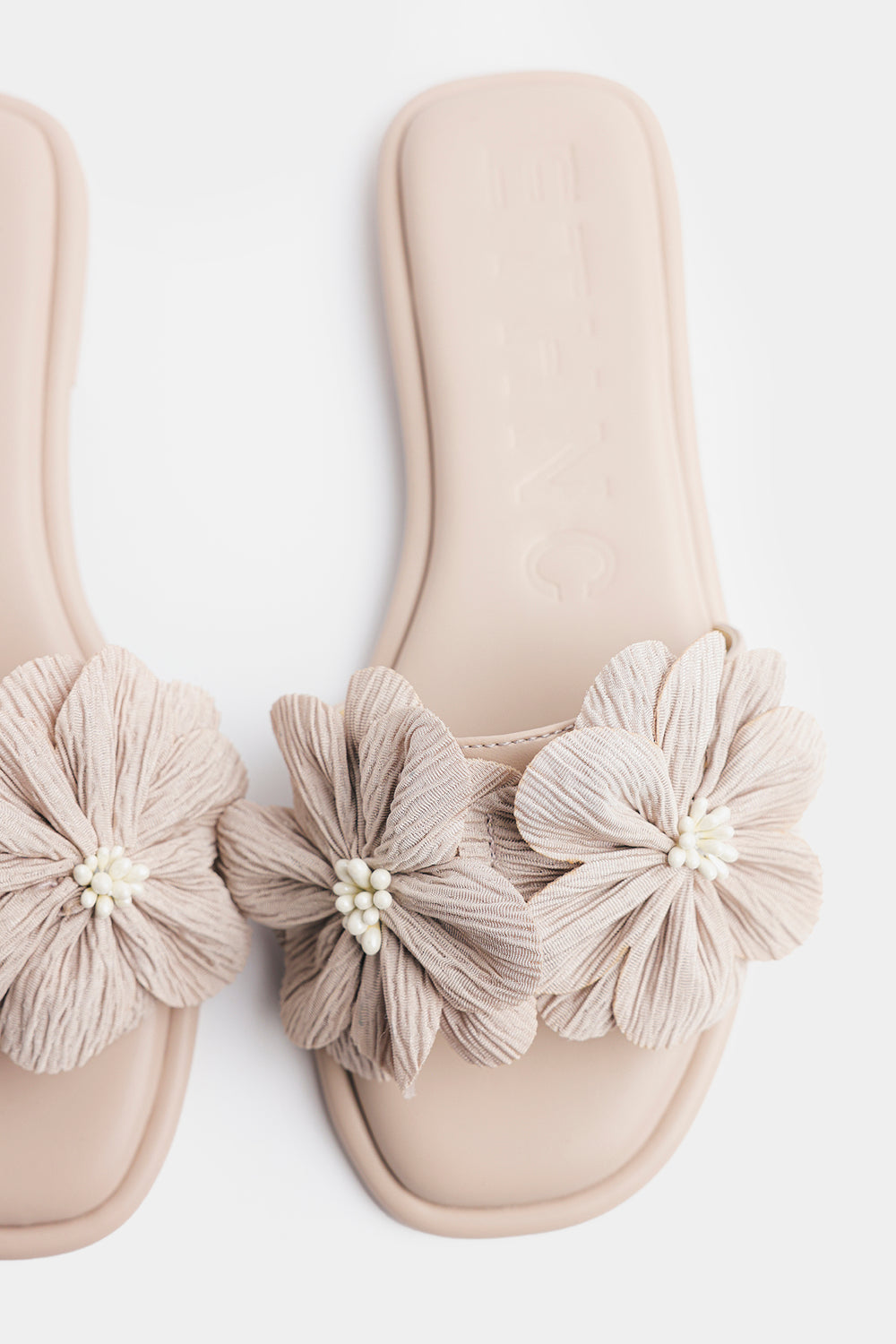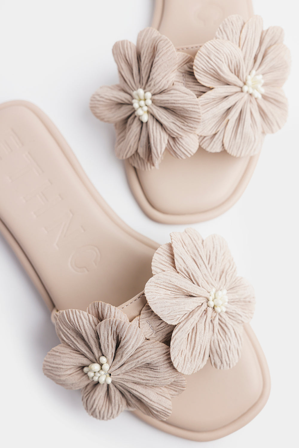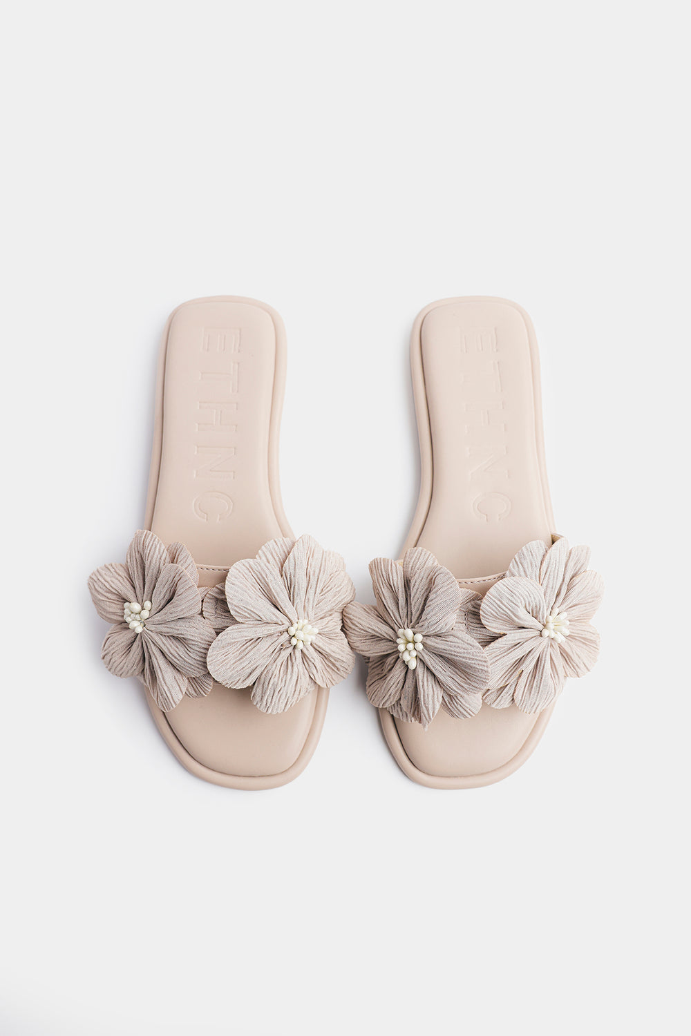 Add a touch of soft sophistication to your everyday style with these elegant floral-appliqué sandals. Crafted in a versatile neutral tone, this pair features a sleek slip-on silhouette with a comfortable cushioned footbed for effortless wear. The delicate oversized fabric flowers, accented with subtle bead detailing, bring a graceful, feminine charm to the design. Perfect for daytime outings, casual gatherings, or pairing with both eastern and western ensembles, these sandals offer a beautiful balance of comfort and style.