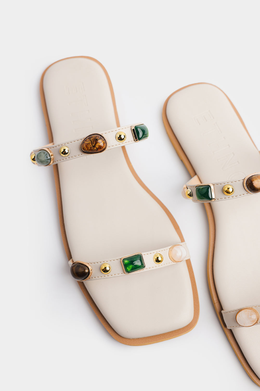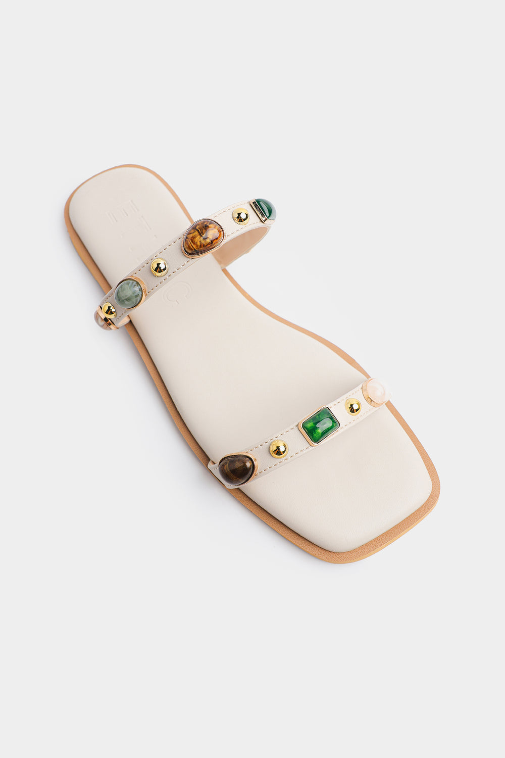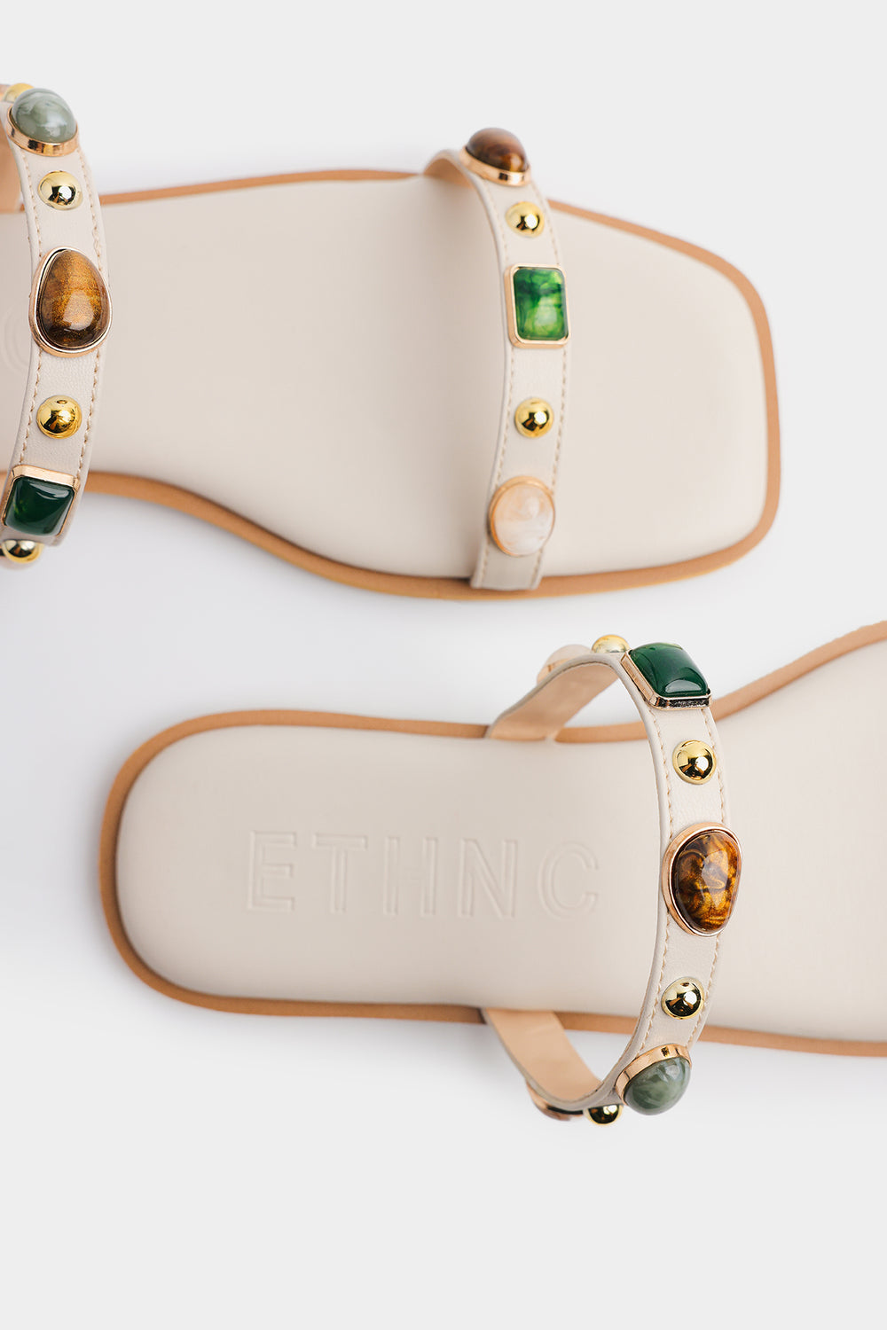 Add a touch of refined glamour to your look with these elegant embellished flat sandals. Designed with sleek dual straps, each band is adorned with an array of multicolored stones and delicate metallic accents for a sophisticated finish. The minimal square-toe silhouette offers a modern edge, while the cushioned footbed ensures lasting comfort. Perfect for elevating everyday outfits or complementing festive ensembles with subtle sparkle.