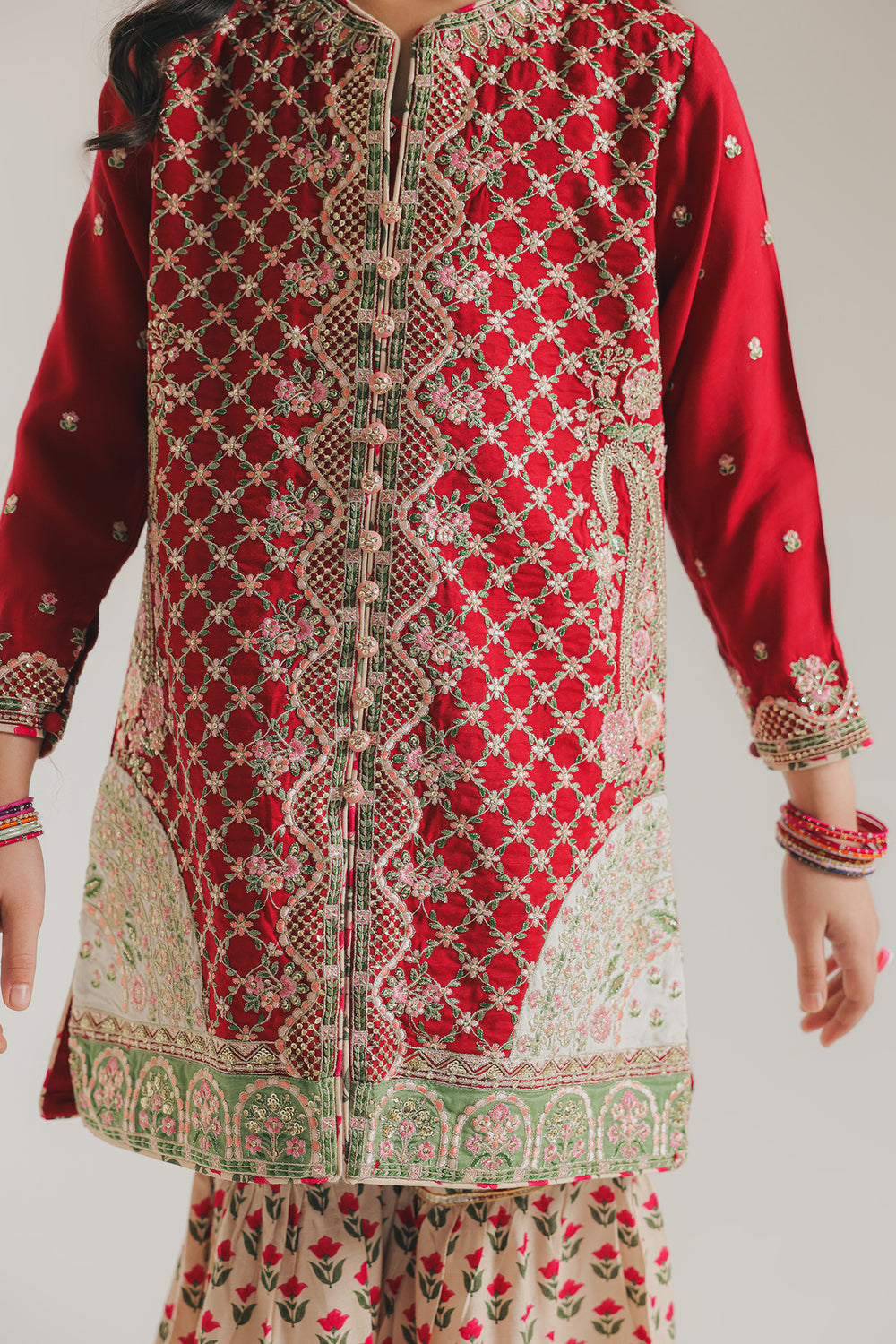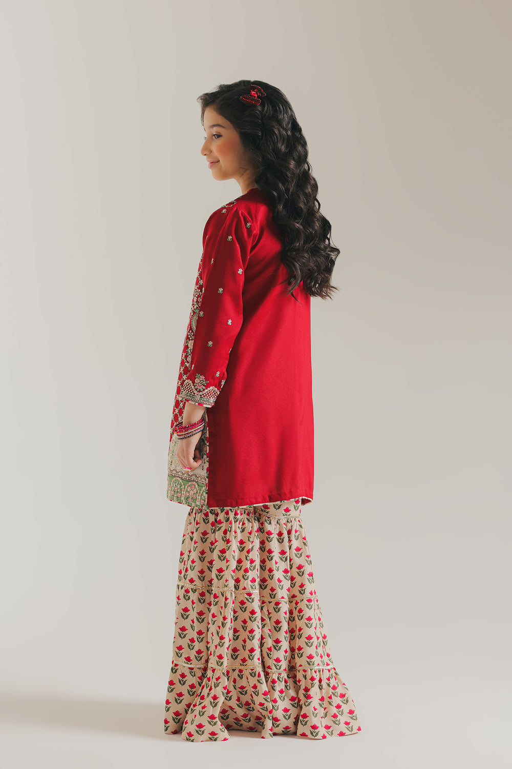 The outfit showcases a festive red long kurta adorned with intricate gold and white patterns, paired with a cream-colored gharara featuring red floral prints. The kurta is embellished with delicate embroidery along the neckline, front panel, and sleeve cuffs, adding a rich, traditional touch. The flared gharara enhances the outfit’s festive charm, while the overall color palette of red, cream, and gold exudes elegance. The look is completed with soft curls and matching accessories, making it perfect for festive or celebratory occasions.
