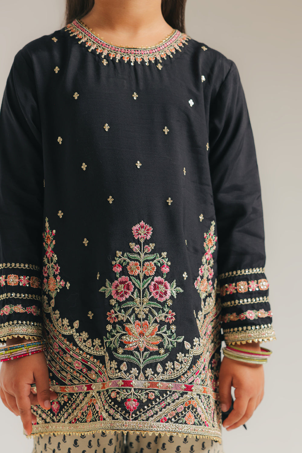This exquisite embroidered suit combines timeless elegance with contemporary styling. The black kurti showcases intricate Resham and Zari embroidery adorning the neckline, sleeve cuffs, and hemline, with delicate scattered motifs across the chest that catch the light beautifully. Paired with cream and beige gharara trousers featuring a striking geometric block-print pattern, the ensemble creates a sophisticated contrast. The gharara's signature gathered knee design delivers the dramatic flare characteristic of this traditional silhouette, making it an ideal choice for festive occasions.