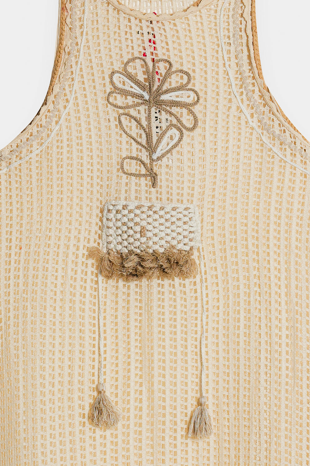 Embrace a free-spirited yet refined style with our timeless-chic dress. This sleeveless dress features a captivating open-knit texture and a flattering A-line silhouette. The eye-catching embroidered motif at the chest adds a touch of bohemian luxury, while the fringed hemline sways with your every move. This versatile piece can be worn as a stand-alone dress or layered over pants for a fashion-forward look. It's the perfect choice for a sunny day out, a weekend getaway, or for adding a touch of effortless style to your everyday.