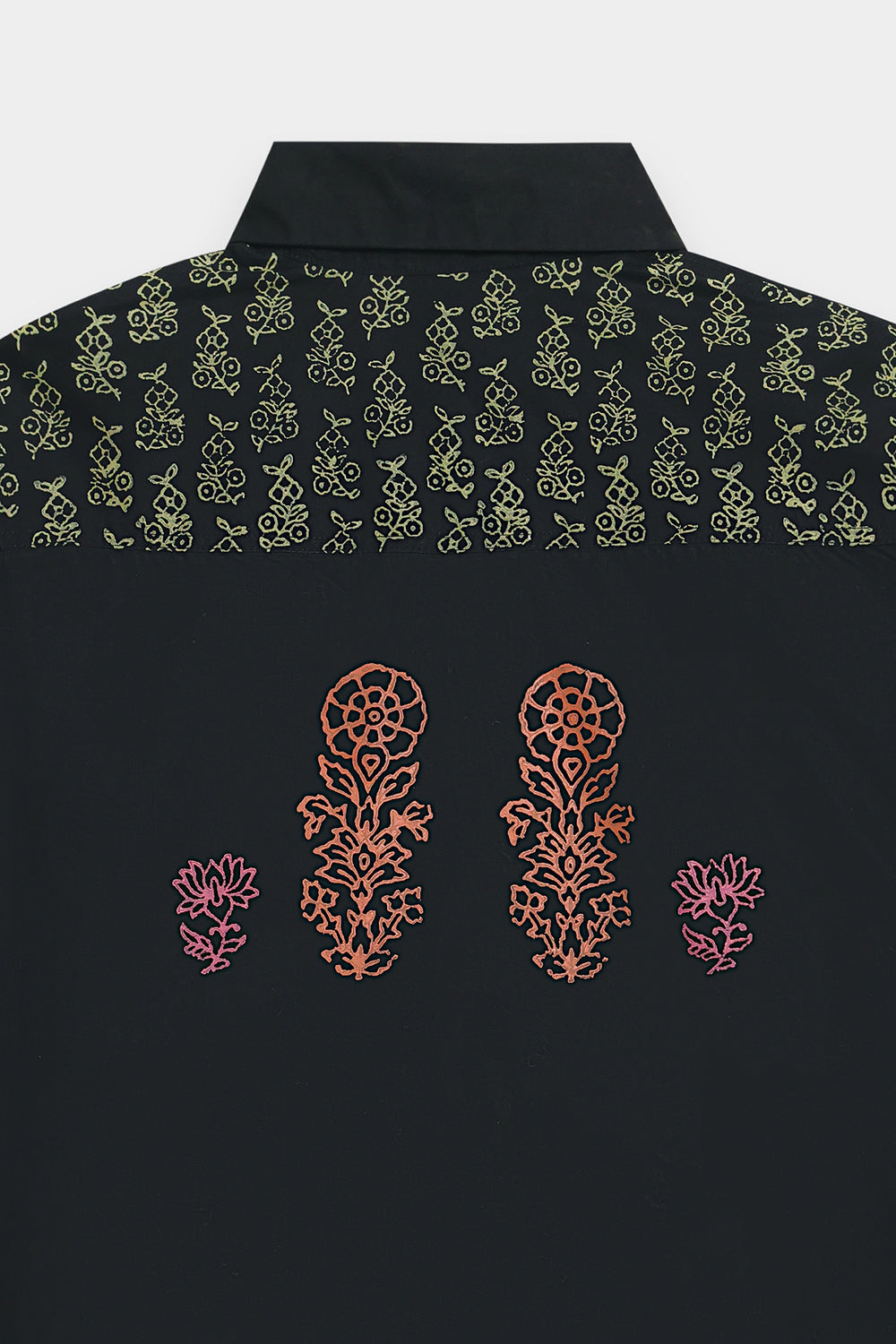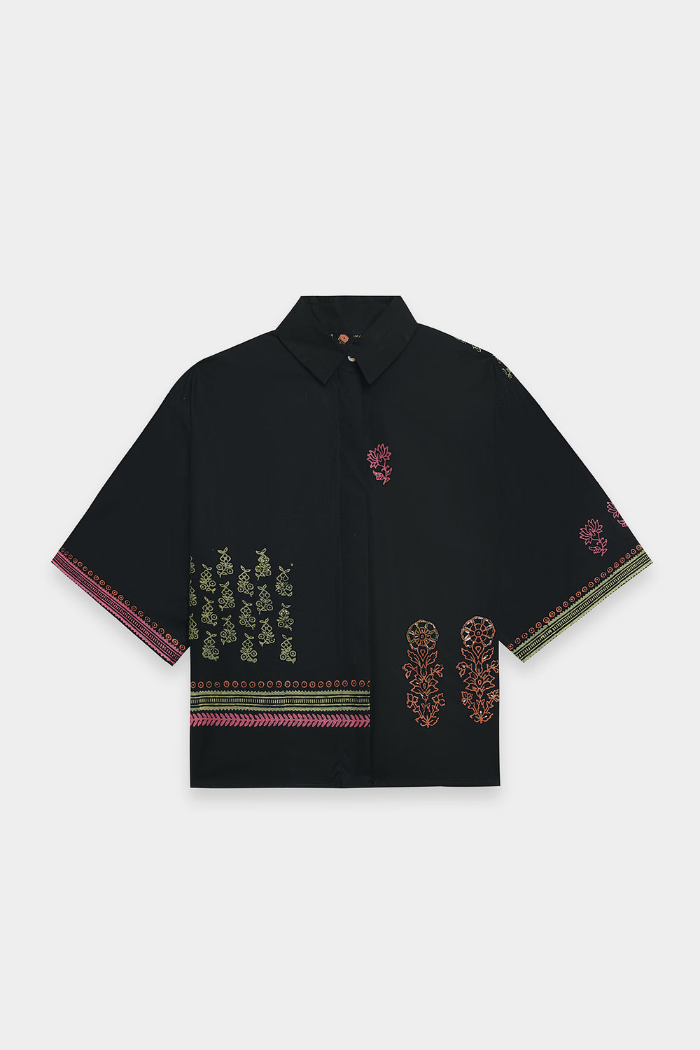 A striking contrast of dark fabric and artful embroidery defines this captivating shirt. The classic short-sleeved silhouette in black serves as a canvas for two unique embroidered motifs—a series of colorful lines on one side and a delicate pattern on the other. This thoughtful, asymmetrical design adds a modern, artistic touch, making it a sophisticated and versatile statement piece.