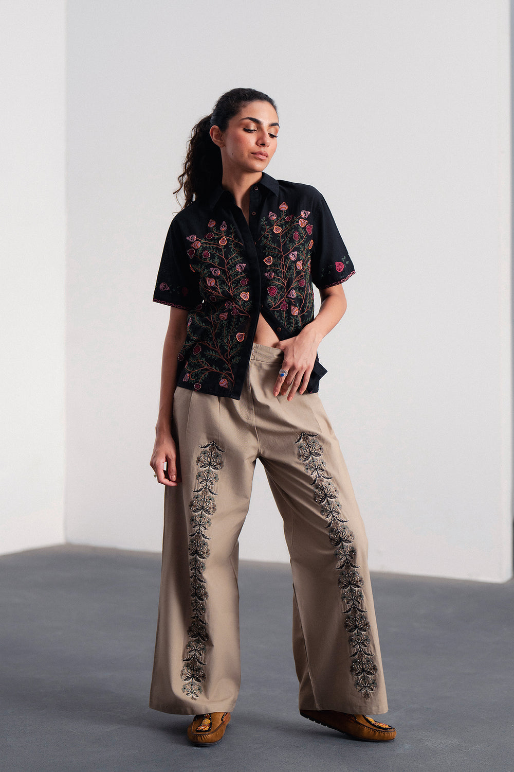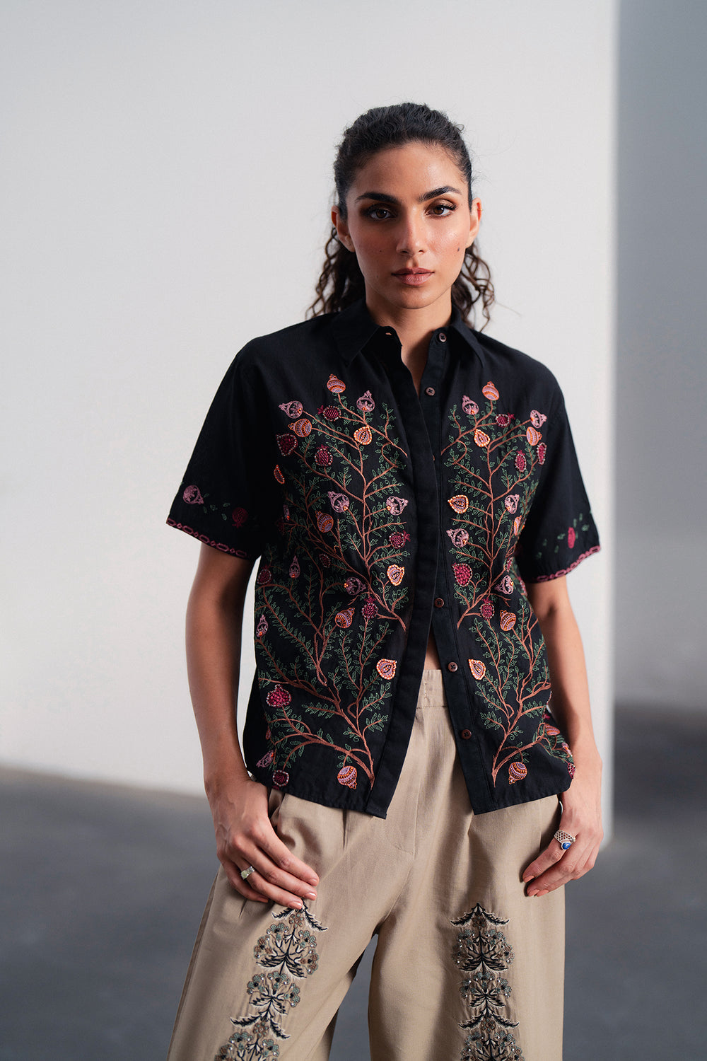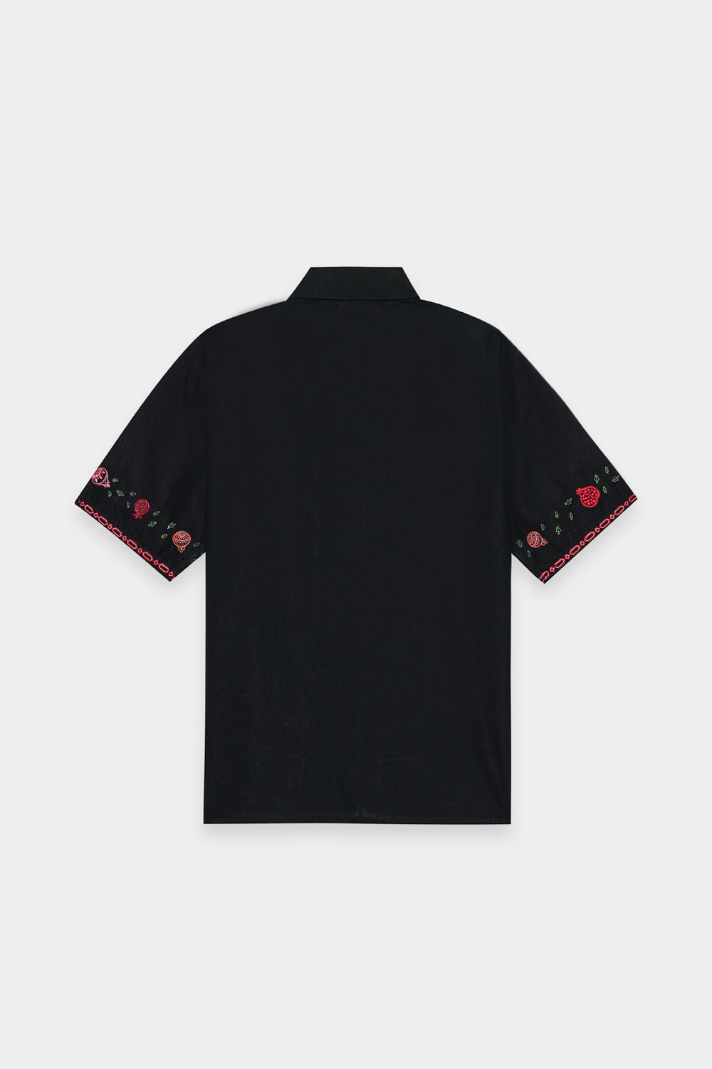 A garden of vibrant embroidery blooms on this stunning black shirt. The classic short-sleeved silhouette is elevated by a breathtaking display of colorful floral motifs that flow gracefully across the front. This piece is a celebration of intricate craftsmanship and artistry, offering a sophisticated and unique look that is sure to captivate.