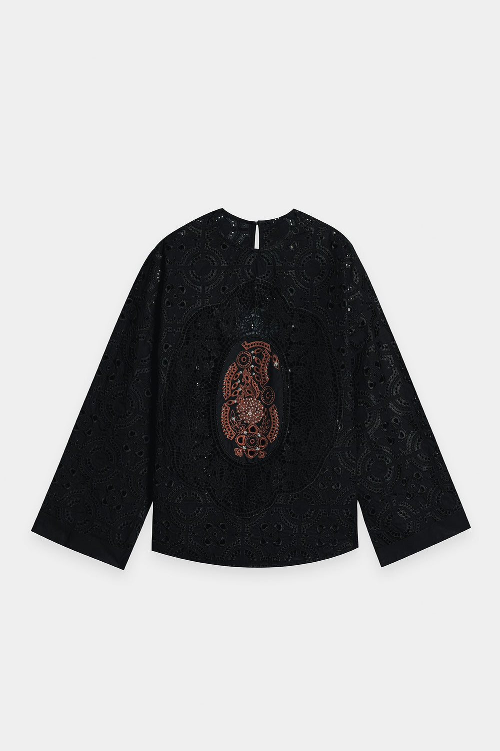 This striking black shirt features intricate cutwork details, creating a beautiful and delicate pattern across the fabric. The front is adorned with an ornate, embroidered motif in warm, earthy tones. The shirt has a relaxed fit silhouette, making it both comfortable and stylish.