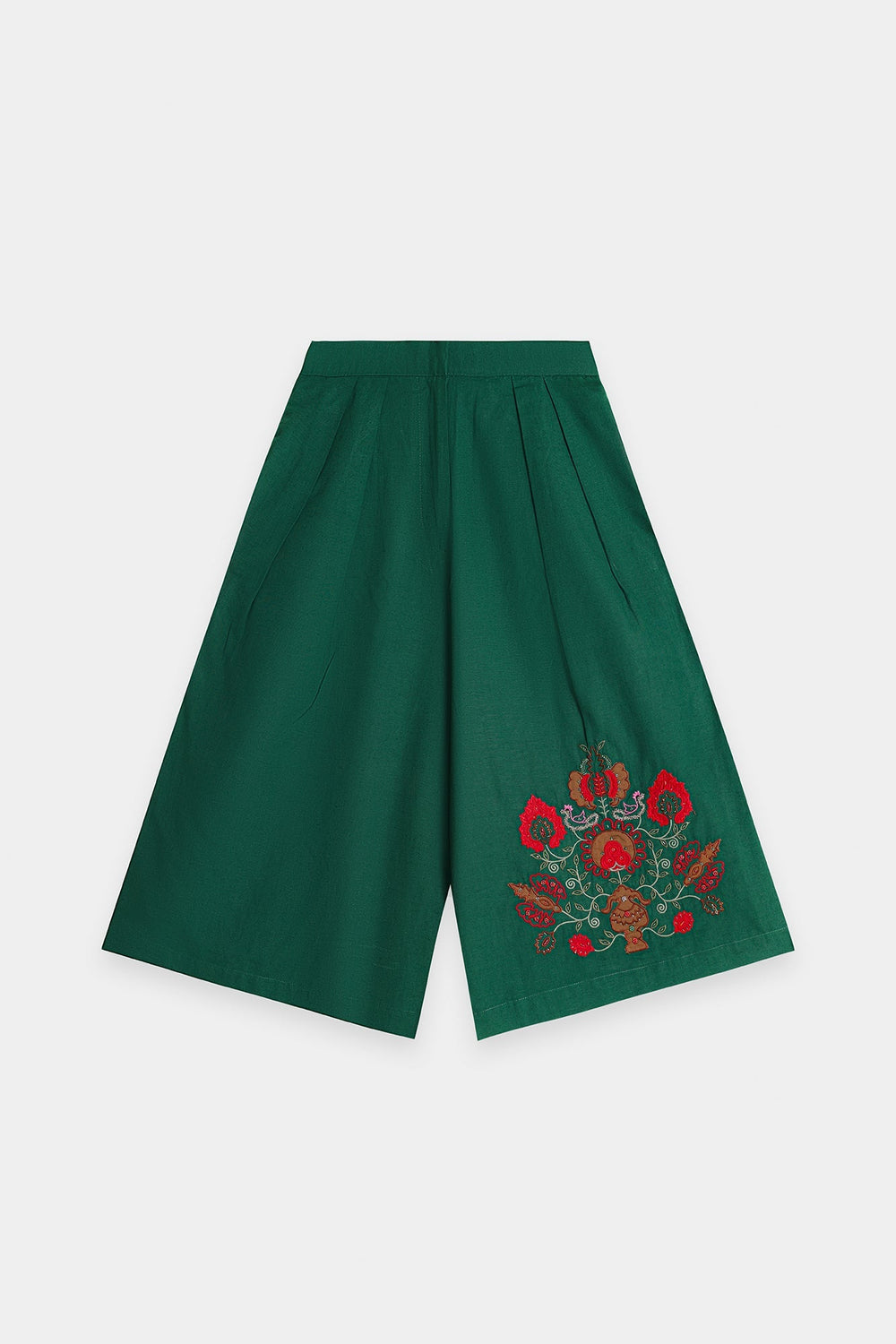 Step into sophisticated style with these artfully embroidered shorts. The wide-leg, knee-length silhouette in a rich green hue offers a comfortable yet chic fit. The design is elevated by a large, intricate motif of florals and a bird, beautifully embroidered with vibrant threads on the side. This piece is a true testament to craftsmanship, perfect for adding a unique and elegant touch to your look.