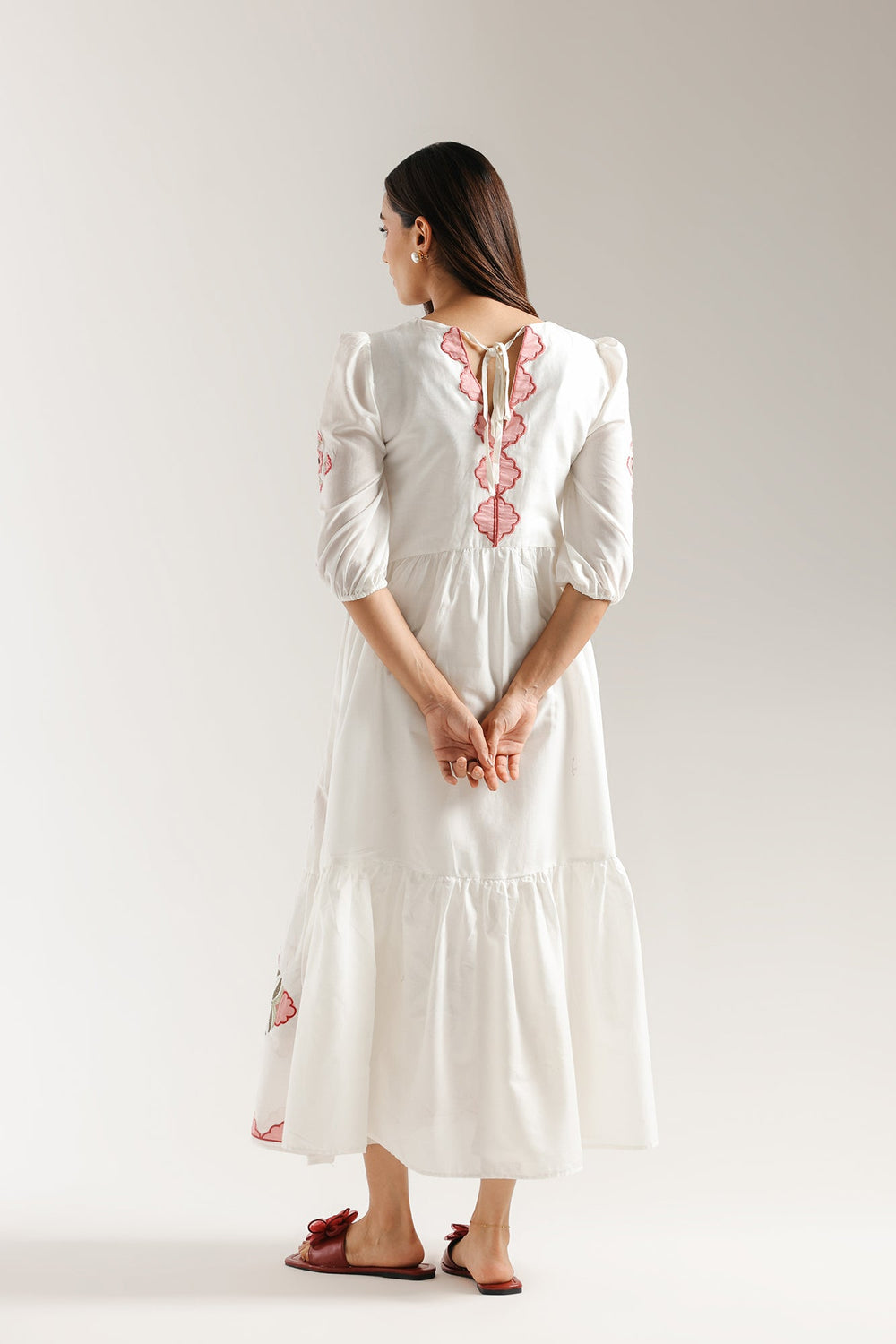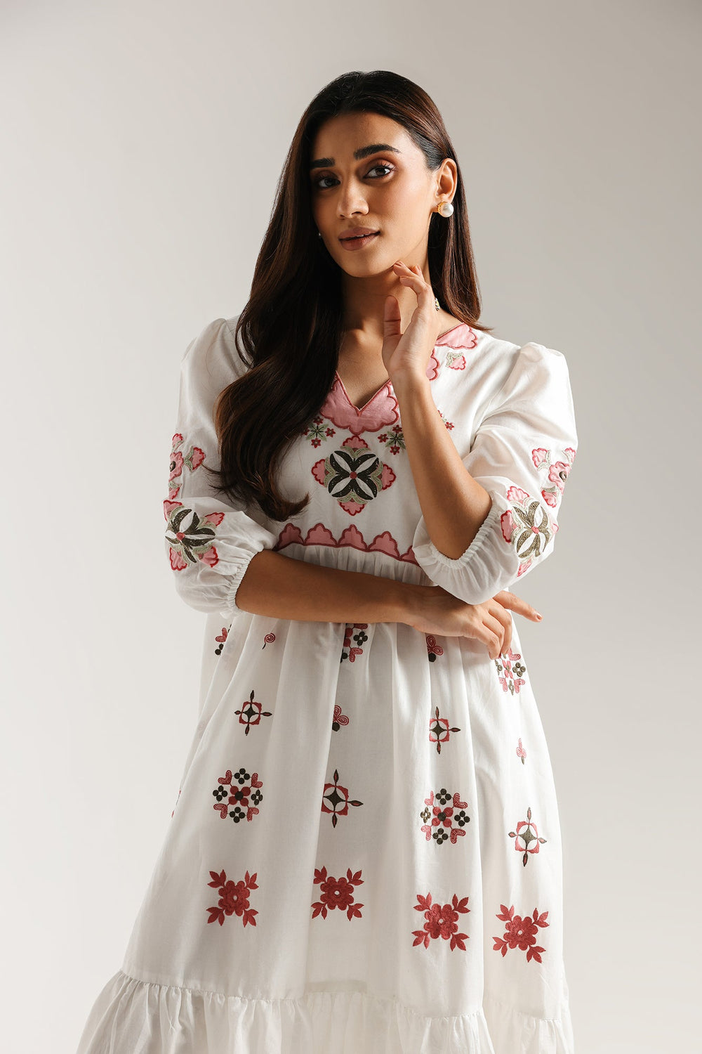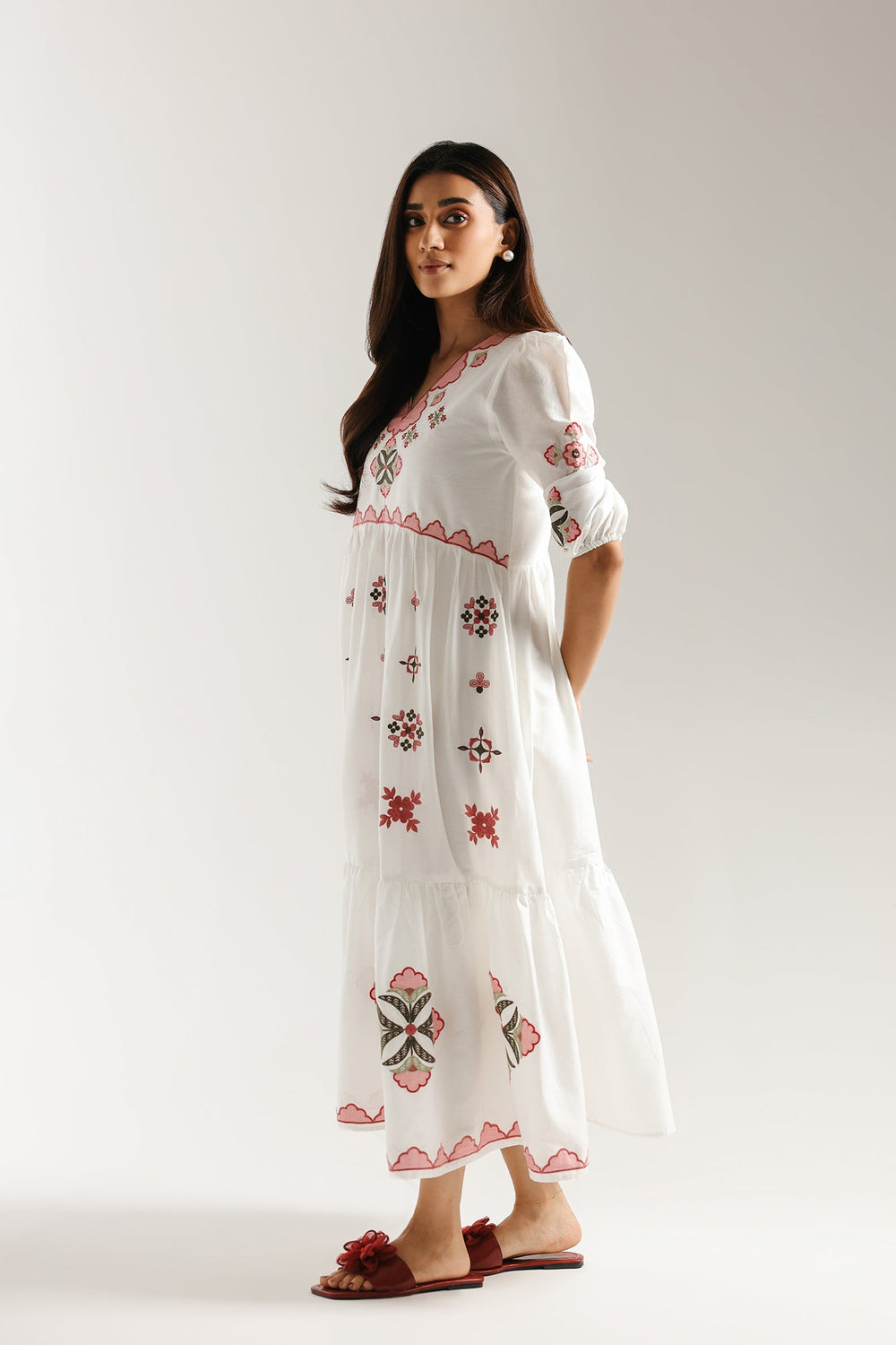 This charming embroidered dress is a celebration of folk-inspired style. The crisp white fabric provides the perfect canvas for the intricate patterns stitched in vibrant shades of pink and green. With its flattering V-neck, elegant three-quarter sleeves, and a graceful tiered skirt, this dress offers a beautifully feminine silhouette. It’s an ideal choice for a sophisticated yet relaxed look.